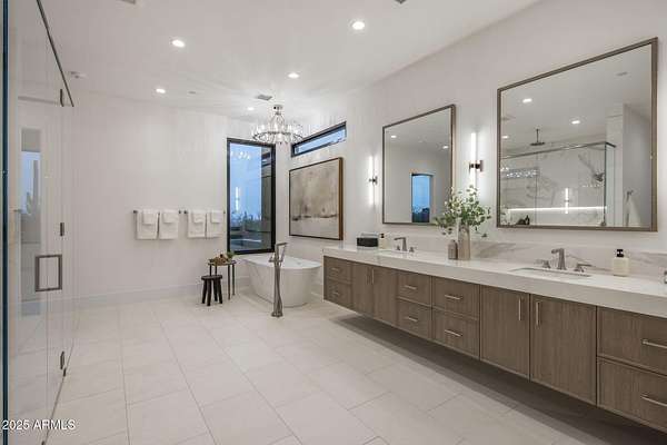 From the moment you arrive, every detail reflects world-class craftsmanship and design. The great room's soaring 15' ceiling and statement fireplace set the stage for gatherings, while the chef's kitchen impresses with a waterfall-edge island, custom cabinetry, Wolf and Sub Zero appliances, premium countertops, and designer lighting. An adjacent bar with glass windows opening to the outdoors makes seamless entertaining effortless, complemented by a butler's pantry, mudroom, and expansive laundry suite. The primary retreat is a sanctuary with dual walk-in closets, a spa-inspired bath featuring a soaking tub under a chandelier, dual vanities, and a luxurious walk-in shower. Two additional bedrooms each with their own bathrooms offer privacy and comfort, while a flexible fourth bedroom/office/flex room adapts to your lifestyle needs.