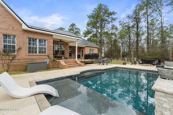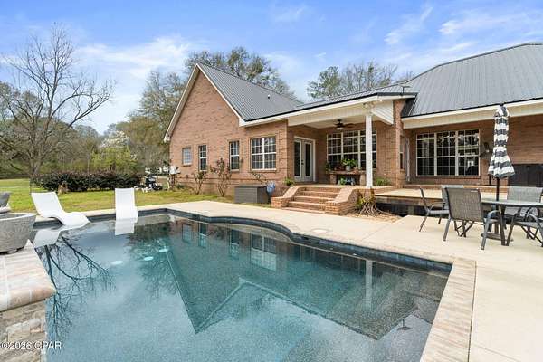 Follow the paved driveway home to this stunning two-story country retreat designed with both comfort and style in mind, topped with a new black metal roof that adds both durability and curb appeal. The home features 4 spacious bedrooms, 3.5 bathrooms, and an impressive open-concept split floor plan that offers plenty of room for everyday living and entertaining. The main level features vinyl plank flooring and a beautiful primary en-suite. Just off the primary bedroom is a flexible room currently used as a home gym, which also provides convenient access to the back porch, patio, and pool area. The primary suite includes a double vanity, soaking tub, walk-in shower, walk-in closet, and its own secure safe room with a built-in floor safe. The kitchen is well-appointed with custom cabinetry, granite countertops, and stainless-steel appliances. Also located on the first floor are two additional bedrooms, a full bathroom, two dining areas, a welcoming living room with a gas fireplace, and a laundry room. The heated and cooled two-car garage adds extra versatility and comfort. Upstairs, the fourth bedroom is currently set up as a fan cave and entertainment space, perfect for watching the big game, hosting karaoke nights, or gathering with friends. This level also includes a full bathroom, making it an ideal private space for guests, a media room, or a bonus living area. Designed for easy indoor-outdoor living, the home offers three separate exits to the back porch, patio, and pool area, including direct access from the kitchen and private access from two of the downstairs bedrooms--making it easy to step outside and enjoy the pool and outdoor living spaces. The backyard is designed for both relaxing and entertaining, featuring cafe lights strung between posts, Adirondack chairs, and a dedicated fire pit gathering area beside the pool. The PebbleTec-lined in-ground pool showcases three waterfalls and two propane-powered fire bowls and operates with an ozone filtration system and chlorine. The chain-link fenced yard also includes a variety of fruit trees and berries, including plums, blackberries, pears, and beauty berries. With 5 acres of space to enjoy, versatile living areas, and a backyard designed for relaxing and entertaining, this beautiful country retreat is ready to welcome you home.