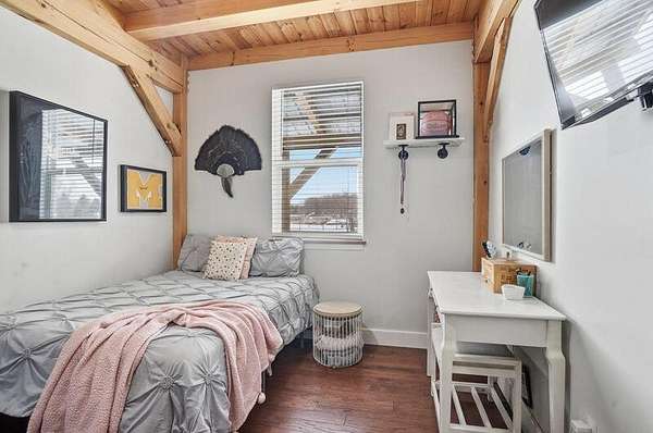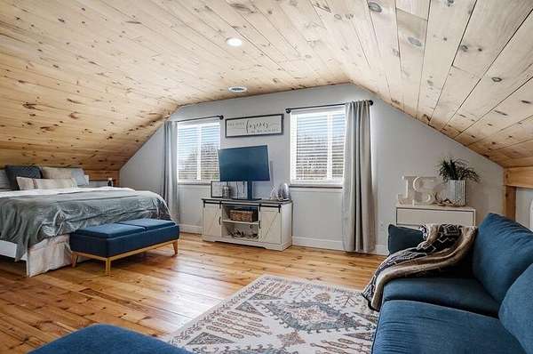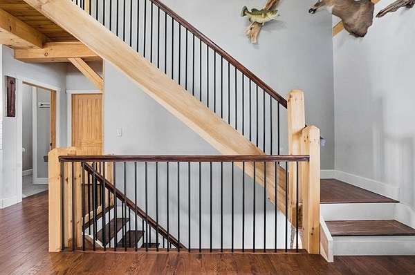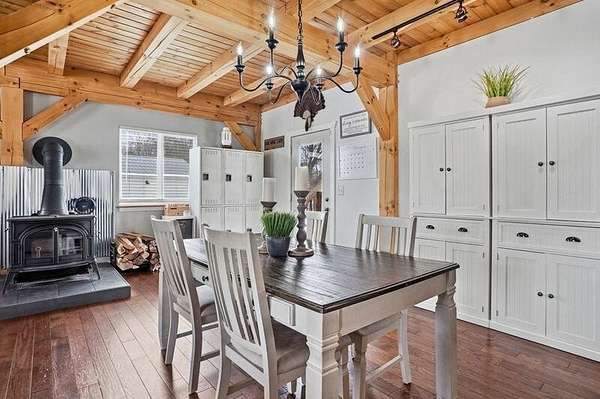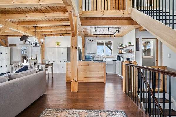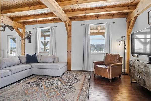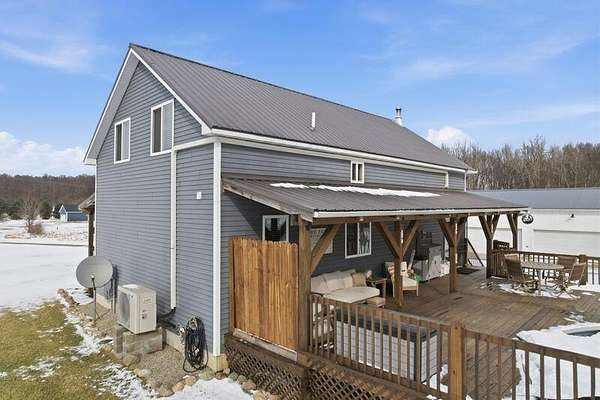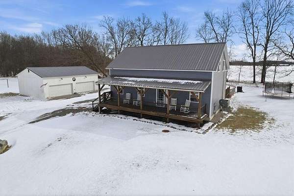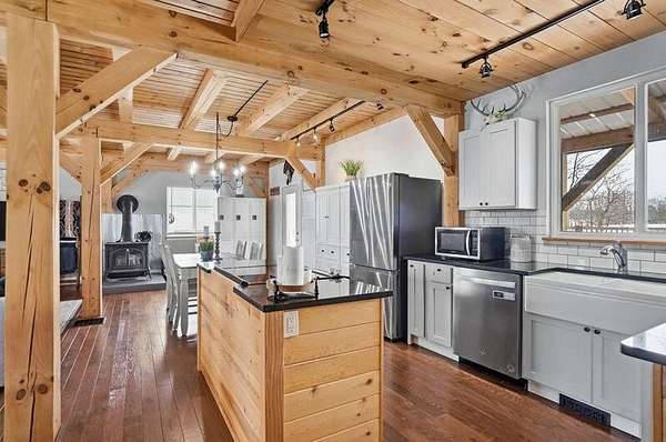 Stunning 4-bedroom, 2-bath timber frame home offers the perfect blend of rustic charm and modern comfort and is nicely tucked away at the end of a private paved cul-de-sac. Set on just over 8 peaceful acres, the property features soaring pine ceilings throughout, creating a warm and inviting cabin feel. The beautiful kitchen showcases classic Shaker-style cabinets, granite countertops, and the open floor plan offers ample space for gathering. Partially finished basement provides extra living space and lots of storage. The large detached 4-car garage and pole barn provides plenty of room for vehicles, hobbies, or equipment. Outdoors, enjoy your own fully stocked pond--ideal for fishing or relaxing by the water's edge. Privacy, craftsmanship, and natural beauty come together in this one-of-a-kind retreat. Call today to book your private showing!