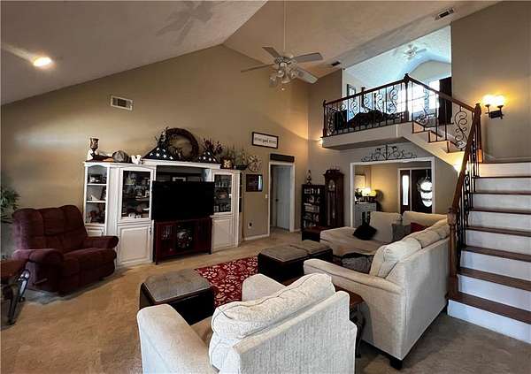 Inside, an open floor plan centers on a vaulted-ceiling great room with a brick fireplace and an upstairs open loft/office overlooking the space. The eat-in kitchen features stainless steel appliances, a raised bar, a large pantry cabinet and flows to a formal dining room. A very spacious foyer welcomes guests, and a separate laundry room adds convenience.