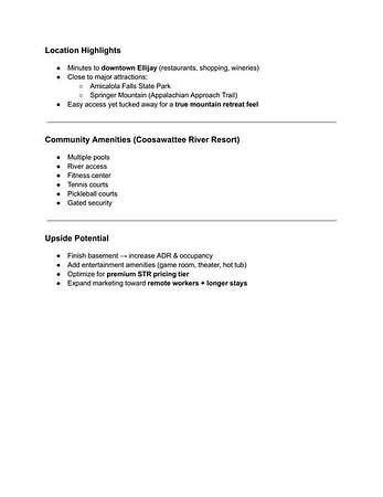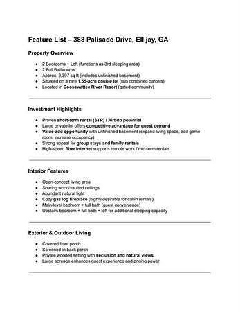 High-Income Airbnb Cabin | 2BR + Loft (3rd Sleeping Area) | 2BA | 1.55-Acre Double Lot | Coosawattee River Resort - Turnkey, income-producing opportunity in the highly desirable Coosawattee River Resort! This 2-bedroom, 2-bath cabin with a loft that functions as a 3rd sleeping area sits on a rare 1.55-acre double lot (two combined parcels), offering the privacy guests pay a premium for and a major edge over competing rentals. With 2,397 sq ft including an unfinished basement, there is immediate value-add potential to expand living space, add a game room, or increase occupancy and revenue. Inside features soaring wood ceilings, an open-concept layout, abundant natural light, and a cozy gas log fireplace-highly desirable for Airbnb appeal-plus a main-level bedroom and full bath for convenience. Upstairs offers an additional bedroom, full bath, and loft to maximize sleeping capacity for larger groups. Enjoy a covered front porch and screened-in back porch overlooking your private acreage, creating the secluded mountain experience today's renters seek. High-speed fiber internet supports remote work stays, further boosting demand. Located minutes from downtown Ellijay and attractions like Amicalola Falls State Park and Springer Mountain, with resort amenities including pools, river access, fitness center, tennis & pickleball courts-this is an ideal STR investment with strong income potential and built-in upside.