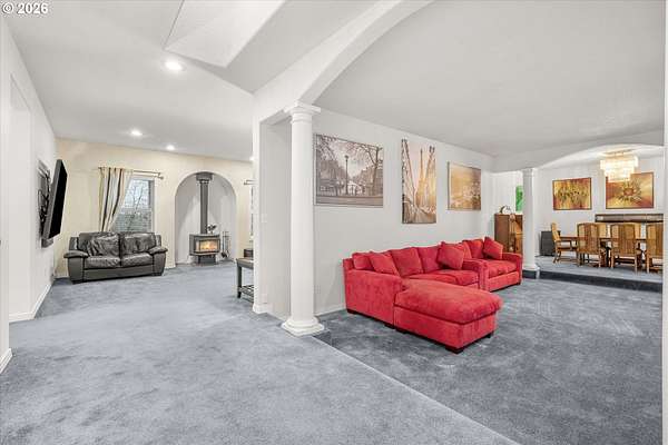 - Ceiling Fan, Central Vacuum, Garage Door Opener, High Ceilings, Laundry, Skylight, Soaking Tub, Tile Floor, Vaulted Ceiling, Wallto Wall Carpet, Washer Dryer