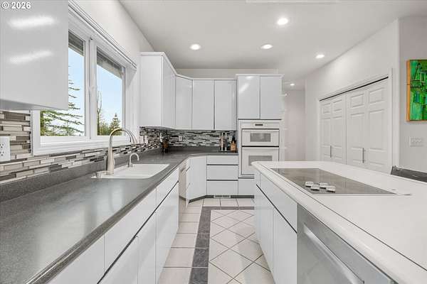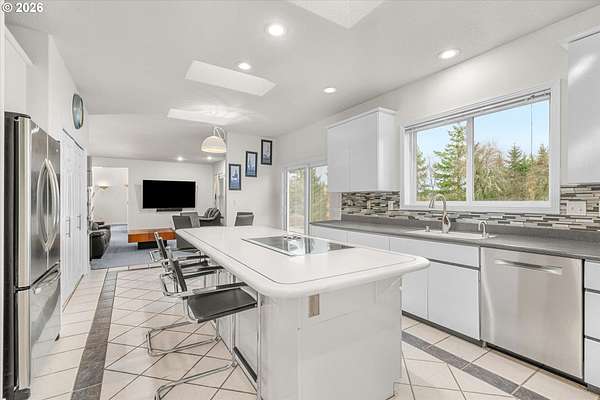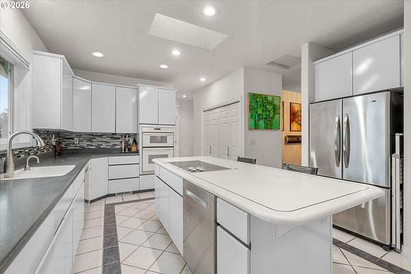 - Builtin Oven, Cooktop, Dishwasher, Free Standing Refrigerator, Island, Pantry, Stainless Steel Appliance, Tile