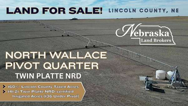 NORTH WALLACE IRRIGATED FARM Located approximately 7 miles north of Wallace, NE on Dairy Road is this very nice pivot irrigated farm which is in the Twin Platte NRD. Take a look at this investment opportunity to own a productive pivot irrigated farm. Highlights of the farm include: Very good county gravel road access 160+/- Lincoln County taxed acres 141.21 Twin Platte NRD certified irrigated acres (136 under pivot) 2012 8 tower Reinke Pivot Electric powered irrigation pumping system Strong tenants in area for investor Buyer Multiple commodity marketing opportunities Looking for a pivot irrigated farm to add to your portfolio? Take a look at this opportunity in southwestern Lincoln County, NE. This productive farm is in an area of competitive tenants for the investor and would be a nice addition to your operation. IRRIGATION EQUIPMENT AND SOILS The pivot irrigation system is a 2012 (8) tower Reinke pivot with 16,934 hours, a 100 hp electric motor installed in 2022 and Western Land Roller irrigation pump that was reworked with a 5 stage bowl assembly in 2023. Registered NE Irrigation well G-061919 was drilled in 1979 and includes 141.21 Twin Platte NRD certified irrigated acres with 136 of the acres under the pivot. The pivot irrigated cropland soils consist of 65.5% Class II Hord and Holdrege silt loams with 0-3% slopes and Hersh-Anselmo fine sandy loams with 0-3% slopes, 23.2% Class III Hersh fine sandy loams with 3-6% slopes. The balance of the cropland consists of Class IV Valent, Hersh and Valentine soils. In the center of the field is a ponding area that drains to the northwest corner of the pivot. This area is about 3.5 acres total. There is a stock tank located on the southwest corner of the farm. Water to the tank is provided by a pump and buried pipeline from a well on the Seller's pivot to the west. Use of this water line can be negotiated with a Buyer. The farm is currently leased out for the 2026 season with a good tenant and lease terms are available from the Broker. ACRES: 160+/- Lincoln County tax accessed acres LOCATION: The pivot irrigated farm is located in southwestern Lincoln County on Dairy Road about 7 miles north of Wallace, NE. LEGAL DESCRIPTION: Township 11 North - Range 34 West of the 6th P.M., Lincoln County, Nebraska Section 8: SW1/4 FSA BASE INFORMATION: Coming soon. REAL ESTATE TAXES: 2025 taxes payable 2026 are $4,324. Twin Platte NRD OCCUPATION TAXES: $987