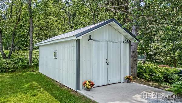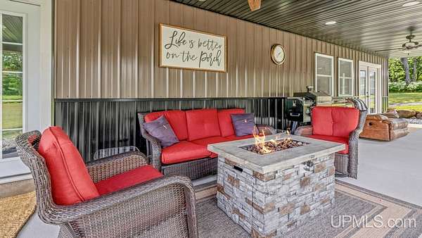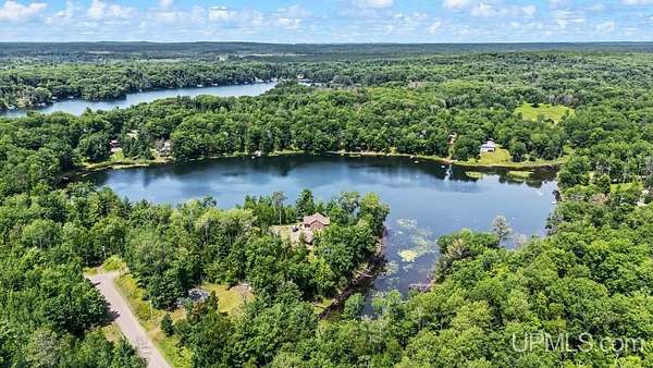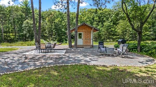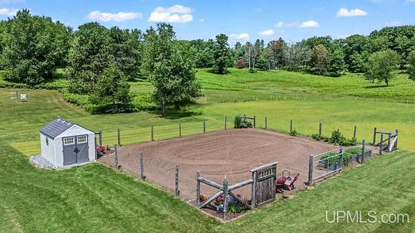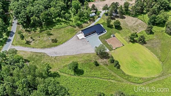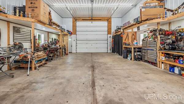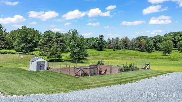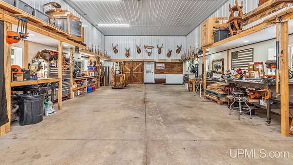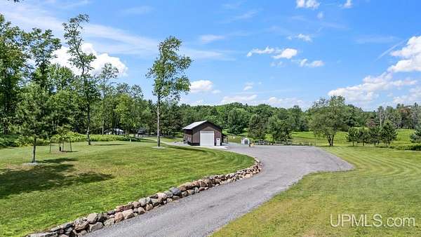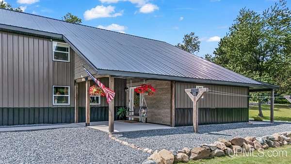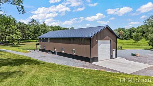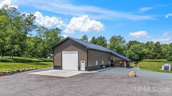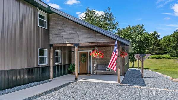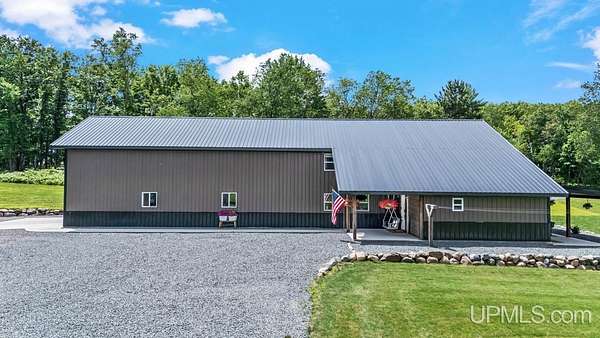 Welcome to an exceptional opportunity to own a newer, contemporary barndominium, hitting the market for the very first time! Nestled on a private 36 acre parcel just 10 minutes from Iron Mountain, this stunning 5 bedroom, 4 bathroom estate offers 2,440 square feet of meticulously designed living space perfect for your entire family. Step inside and discover an open-concept floorplan that seamlessly blends style and functionality. The heart of the home features a spacious kitchen complete with large island, walk-in pantry, and convenient coffee bar. From the living room, two sets of French doors lead to a covered backyard patio, an idyllic spot to unwind, listen to the birds, and watch deer and turkey meander by. Upstairs, you'll appreciate the ease of a second-floor laundry area. The stunning primary suite is a true sanctuary, boasting vaulted tongue-and-groove ceilings and a gorgeously tiled walk-in shower. Beyond the exquisite home, this property offers serene, rolling countryside views, mature oak forests, a small pond, and natural landscaping. Cultivate your passion for gardening in the extra-large fenced garden or start your own hobby farm with the existing 16x12 chicken coop. The heated 44x28 garage/workshop features impressive 16-foot walls and a 14x14 overhead door, providing ample space for all your vehicles, toys, and projects. Adventure awaits right from your doorstep with direct access to Blue Ox Trails for ATV riding and snowmobiling. Plus, you're just moments away from numerous lakes, rivers, and the beautiful Spread Eagle Barrens. You've worked hard to enjoy life's finest. Now is the time to own your very own slice of Northwoods heaven!