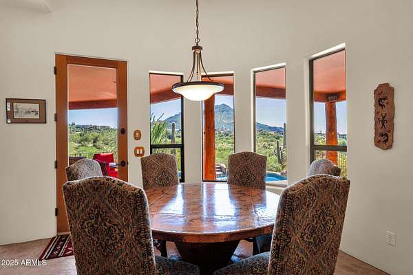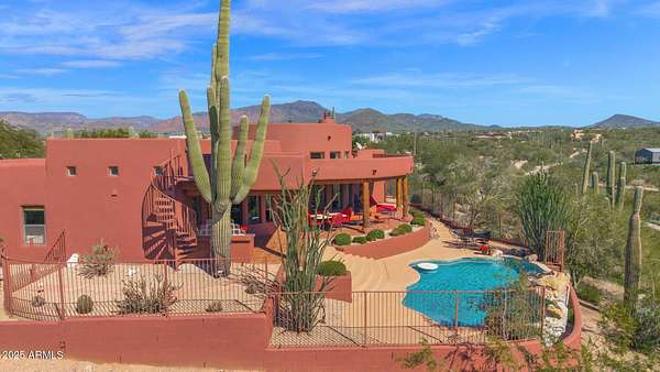 Discover the best of Cave Creek living from this elevated 2.8-acre retreat with direct, up-close views of Black Mountain and spectacular sunsets! Enjoy privacy, no HOA, and an ideal location just moments from the charming shops, galleries, & dining in town. The well-maintained, single-level home offers zero interior steps, high ceilings, and expansive windows that fill the living spaces with natural light. The open floor plan includes 3 bedrooms plus an office. Outdoor living is exceptional - south-facing patio, sparkling Pebble pool with waterfall, and a rooftop view deck to take in panoramic mountain vistas. Whether relaxing poolside, entertaining under the stars, or watching the sun set behind the mountains, this home offers a rare combination convenience & comfort, plus is move in ready!
