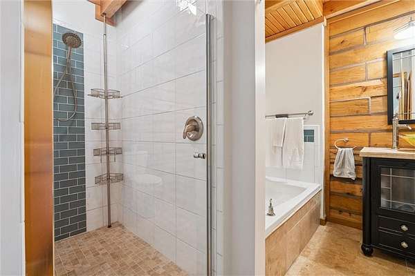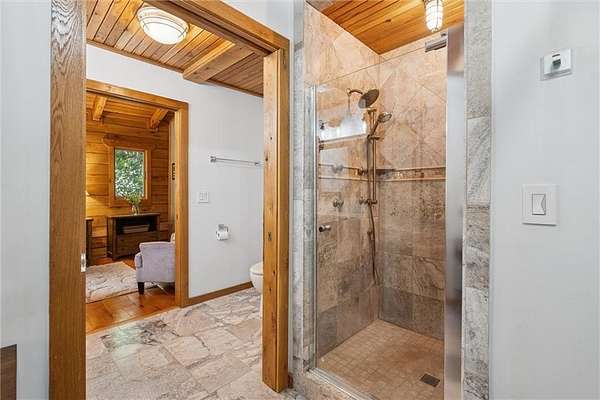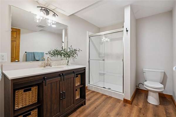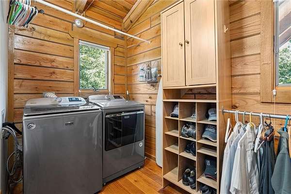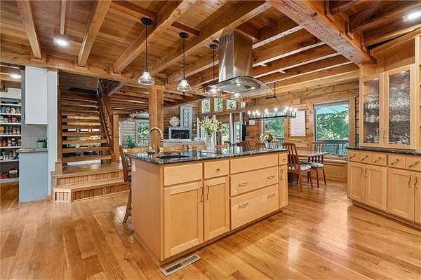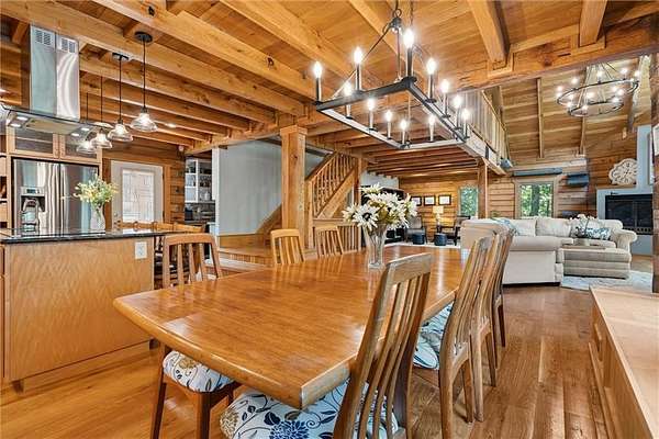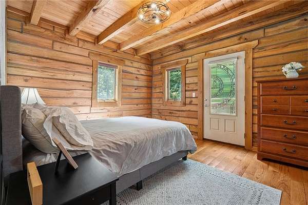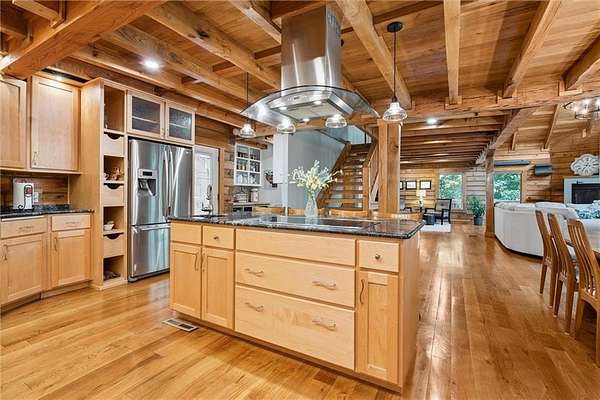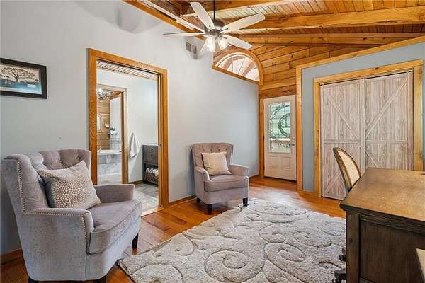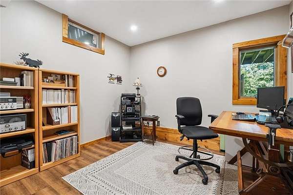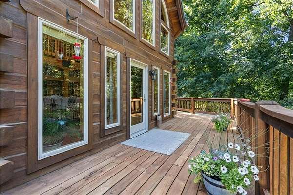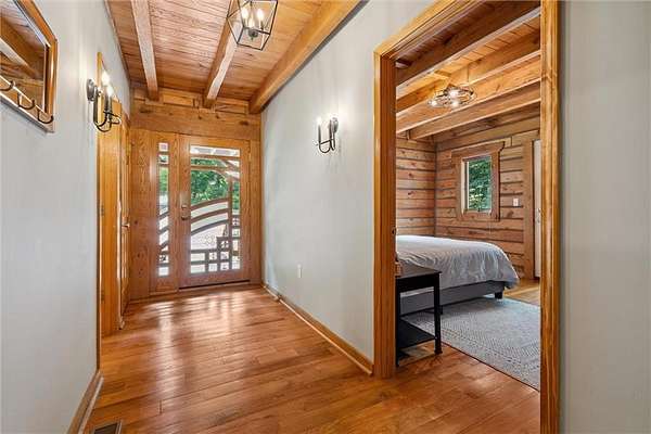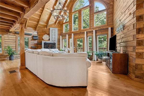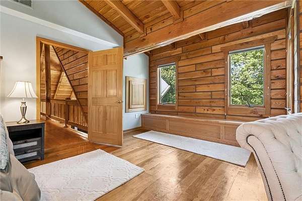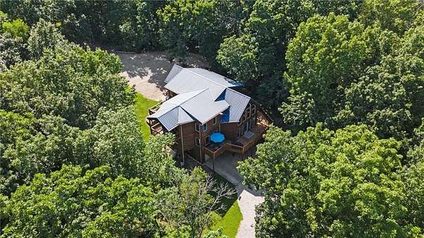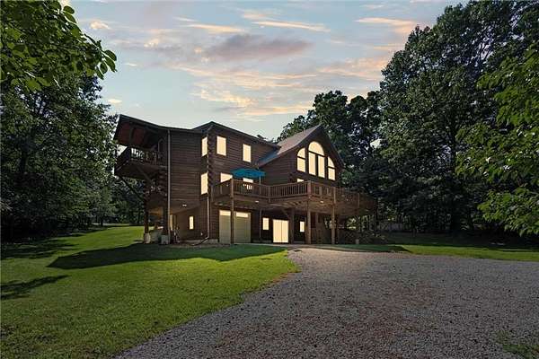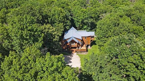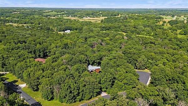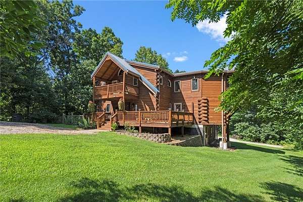 Stunning Log Home on 5 Wooded Acres! So much privacy and situated on all paved roads just 20 Minutes from Lee's Summit! This custom log home offers over 3,500 sq ft of finished living space across three levels. It is nestled on 5 acres in an established rural neighborhood with paved roads as well. Upgrades: Whole House Generac and gas fireplace powered by propane and immediate backup power! Upgraded custom lighting inside and out and sellers finished the walkout basement which includes a second laundry and new hot water heater. Step inside to soaring vaulted ceilings, expansive windows that flood the home with natural light and rich hardwood floors throughout. Main level features a dramatic two-story Great Room with cozy gas fireplace, spacious dining area, and a chef's dream kitchen complete with custom cabinets and a finished walk-in pantry. A main-level bedroom includes a built-in dresser/vanity with full bath across the hall. Upstairs, the open loft is a great hangout/office and overlooks the great room with lots of natural light. The upper loft also leads to the luxurious primary suite, offering custom built-ins, a private deck, a walk-in closet with laundry hookups, and a spa-inspired ensuite bath. An additional upstairs bedroom with a separate deck completes the upper level. The finished walk-out lower level adds over 600 sq ft of versatile living space, including a family room with direct patio access, a coffee/wet bar, a fourth bedroom, an office, full bath, second laundry area, ample storage, and 1 car garage. Enjoy the outdoors and privacy from multiple decks and porches surrounding the home! The second driveway offers space for additional parking or an out-building. Whether you're entertaining, relaxing, or working from home, this property offers the ideal blend of rustic charm, modern convenience, and peaceful seclusion.