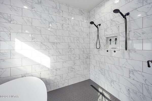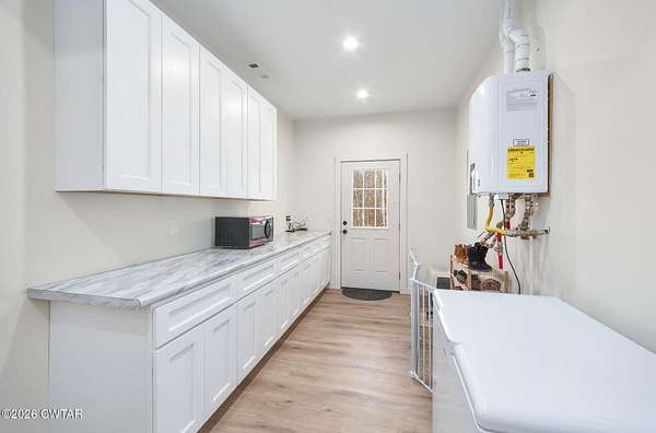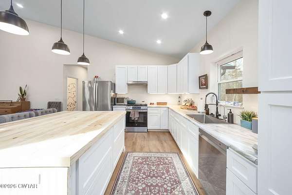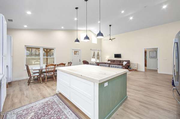 - Butcher Block Counters, Ceiling Fan(s), Ceramic Tile Shower, Eat-In Kitchen, High Ceilings, Kitchen Island, Pantry, Primary Downstairs, Soaking Tub