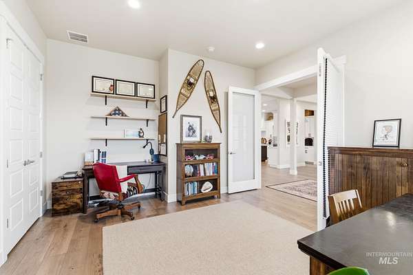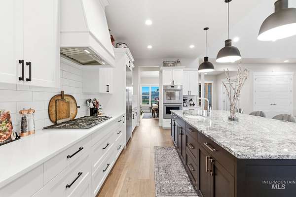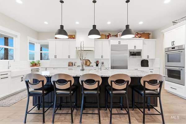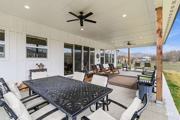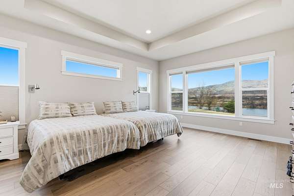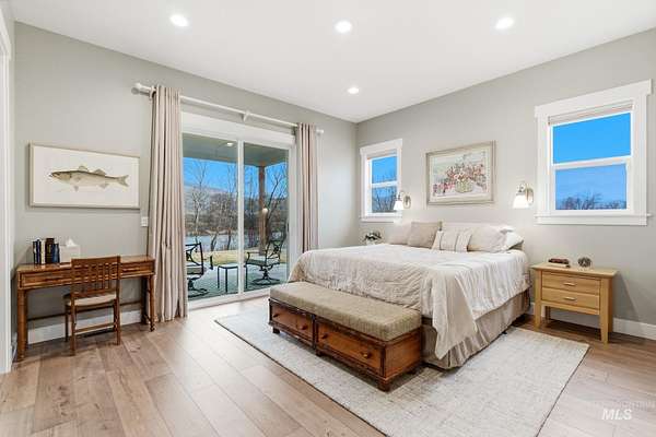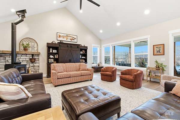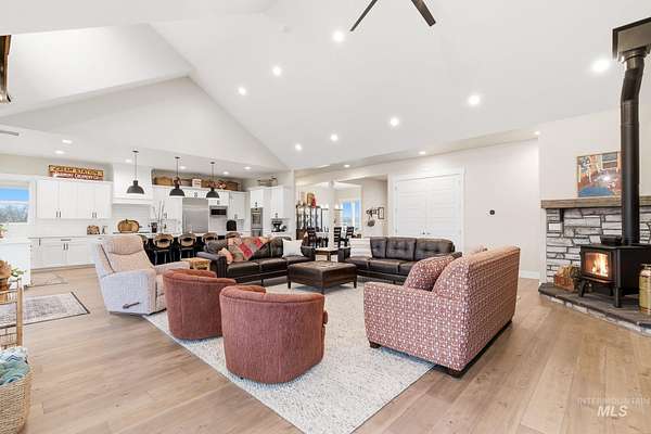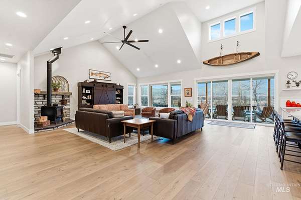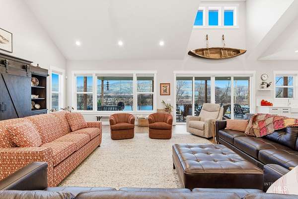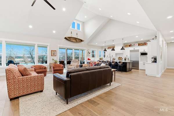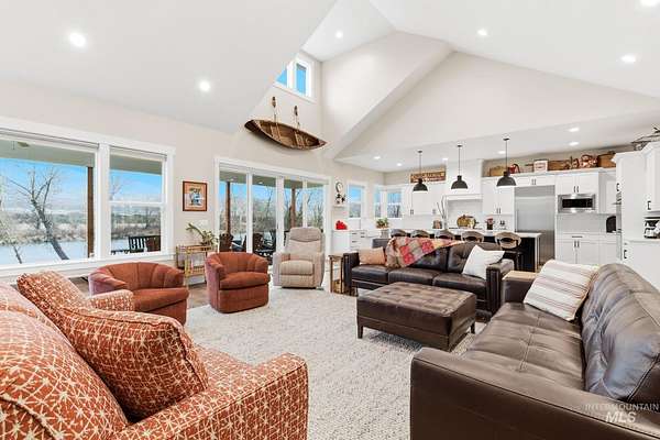 Rare opportunity to own 6 acres of premier riverfront property in beautiful Emmett along the scenic Payette River. With approximately 306 feet of private river frontage, this exceptional estate offers direct access to fishing, floating, kayaking, and abundant wildlife, all set against sweeping mountain views and Idaho's breathtaking natural beauty. The spacious residence showcases a modern open-concept design filled with natural light, featuring rich hardwood flooring, soaring vaulted ceilings, and a warm wood-burning fireplace anchoring the great room. Expansive windows and sliding glass doors frame stunning river vistas, seamlessly blending indoor comfort with the outdoors. The custom kitchen is elegantly appointed with granite countertops, modern cabinetry, a generous center island, farmhouse sink, built-in microwave, quality appliances, and a walk-in pantry. The flexible layout offers three bedrooms, including a private en suite ideal for guests or multi-generational living. The primary suite serves as a peaceful retreat with captivating river views, dual vanities, a walk-in shower, deep soaking tub, and a spacious walk-in closet. Outside, the level acreage features 30+ mature fruit trees and ample room for horses, livestock, gardening, or creating your own hobby farm sanctuary-an exceptional opportunity to embrace the Idaho lifestyle.