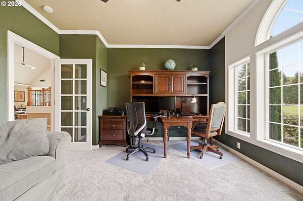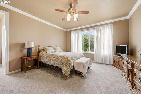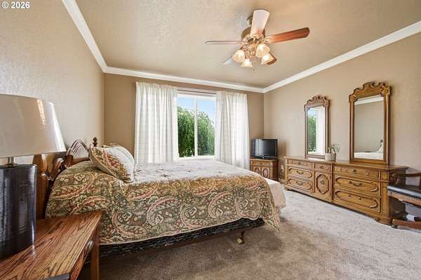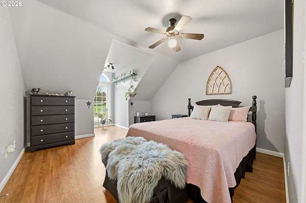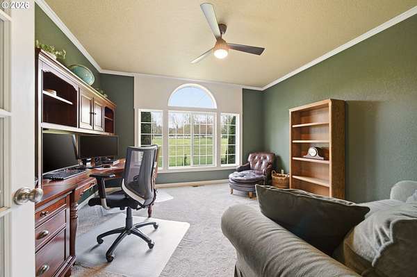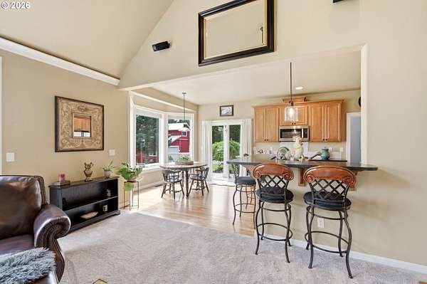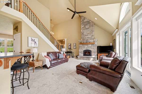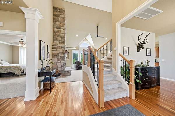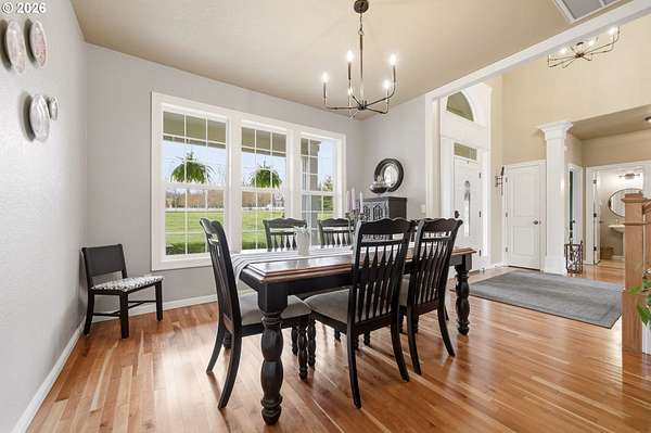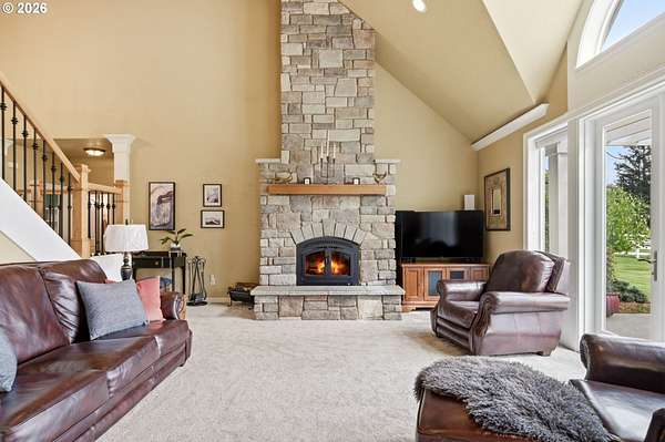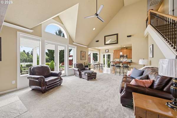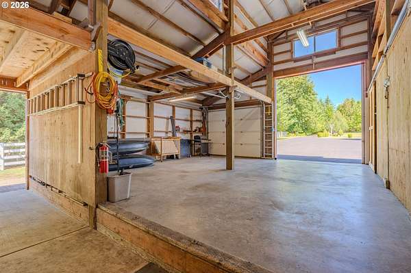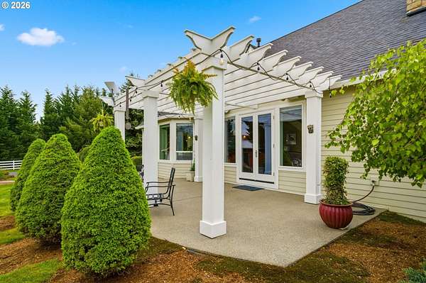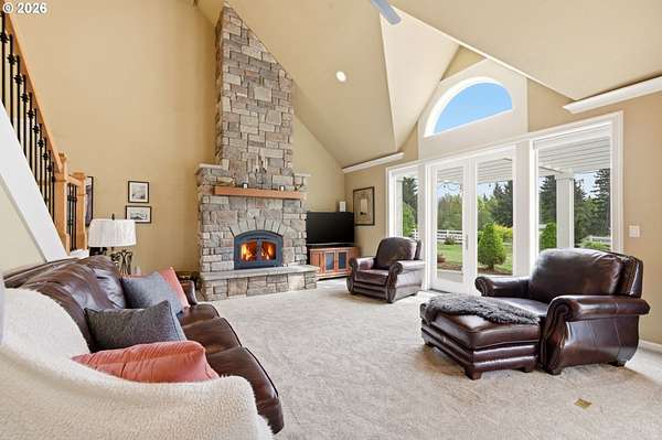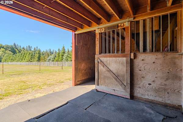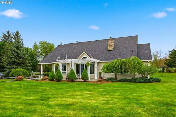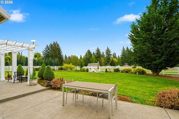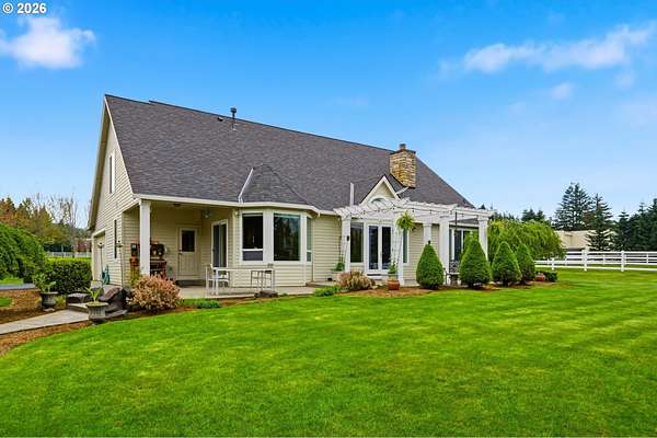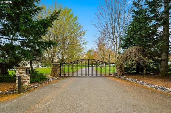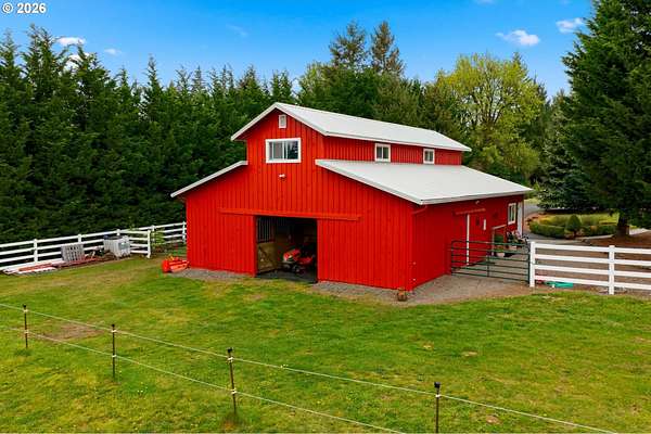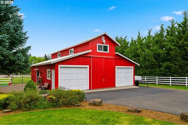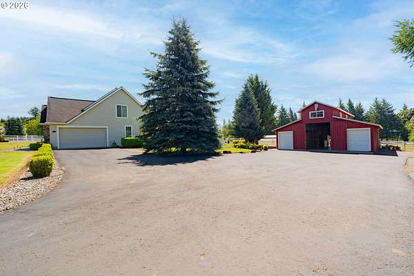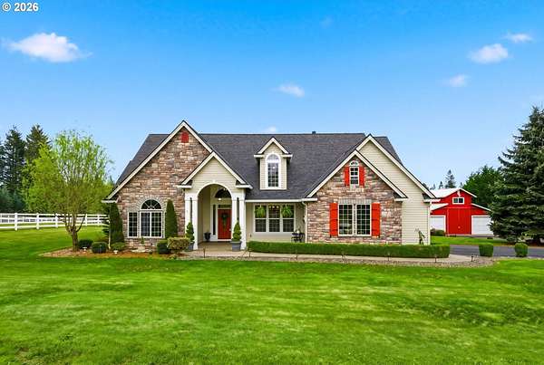 Welcome to this stunning equestrian estate-an exceptional retreat nestled within a beautifully maintained community. A gated entrance offers privacy and sets the tone for a perfect blend of luxury, functionality, and pastoral charm. Situated on five flat, fully usable acres, this horse-ready property features elegant four-rail fencing, two expansive pastures, and a well-designed paddock. The grounds are lush and thoughtfully landscaped with a five-zone sprinkler system and dedicated garden area with raised beds. The beautifully updated 3-bedroom, 2.5-bath home offers warmth and style, with a new roof, carpet, updated countertops and backsplash, modern lighting, and newer appliances-truly move-in ready. The main-level primary suite includes a jetted tub, while the vaulted great room with a wood-burning fireplace opens to a spacious patio with pergola, ideal for entertaining. A formal dining room, dedicated office with hardwood floors, inviting kitchen with eat bar and breakfast nook, mudroom, and attached two-car garage complete the main level. Upstairs offers two additional bedrooms and a versatile bonus room. The impressive three-bay barn/shop features an oversized 11.5-foot door, 220-volt power, and insulated ceilings and floors. The rear includes two plumbed horse stalls, a wash area, ample storage, and a large hay loft-perfect for equestrian living. This property offers the ideal combination of comfort, space, and equestrian excellence.