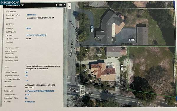 Welcome to 3894 El Nido Ranch Rd, Lafayette! Amazing opportunity to build on a totally flat Happy Valley, Lafayette location, surrounded by multi-million dollar homes. TWO approved addresses (Contact City of Lafayette to get 2nd address, they will designate 2nd address #) to build your dream Home with ADU; or 1 DUPLEX (Buyer and Buyer Agent to confirm). This scarcely available .33 acre flat lot with very close proximity to popular Downtown Lafayette offers great access to the Lafayette Reservoir, BART, and Hwy 24 freeway. Enjoy the mature oak tree views and one of the best neighborhoods Lafayette has to offer. The possibilities are infinite. Large totally level pad with all Utilities easily accessible, and active well on the site. Newly subdivided. Start your design immediately.