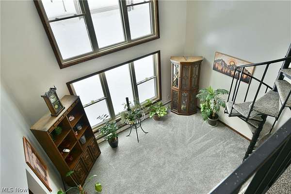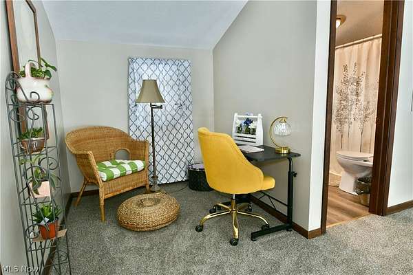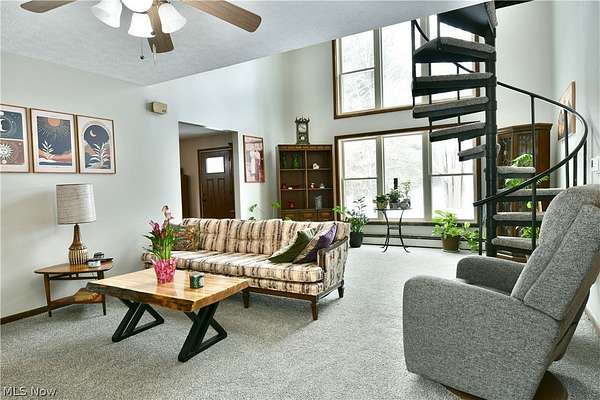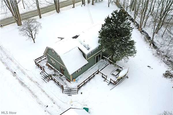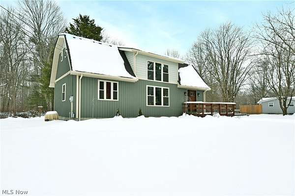 Immerse yourself in the peaceful serenity of the woodland nature-scape found within the five outstretched acres included with this must-see Leavittsburg estate! A style like no other, this barn shaped offering is sure to have you falling in love at first sight with its engaging colors and oversized, detached two car garage with second floor loft space. Adding to the appeal, a wrapping and raised deck envelopes the home as it leads around back for easy entertaining. Stepping through the formal entryway, a gracious dining room awaits with hardwood styled flooring as it offsets the secondary side entry point. Here, a galley kitchen offers an array of stained wood cabinetry to pair with a glass tile backsplash at the hooded stove. The central living room steals the show, doused in natural light that spills across the plus carpets. The front portion enjoys towering, second floor ceilings with two tiers of glass that rise with the decadent, spiral staircase. Meanwhile, sliding glass doors open to the rear deck. Completing the floor, a sizeable master bedroom joins a lavish full bath and its low step shower. Upstairs, a quaint lounge joins the catwalk while a pair of colorfully appointed bedrooms each flank the second full bath. Laundry and storge are found at the basement level. Call today for your private showing!