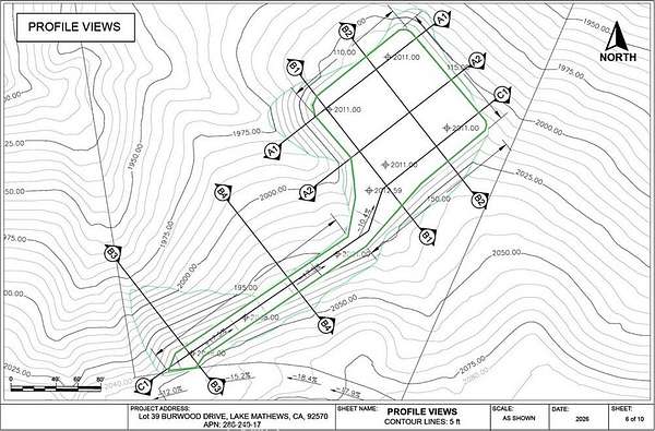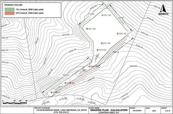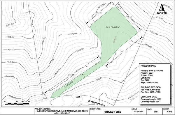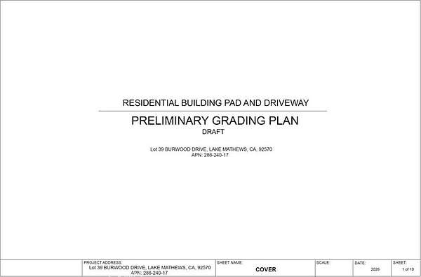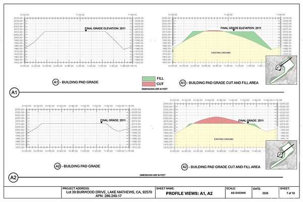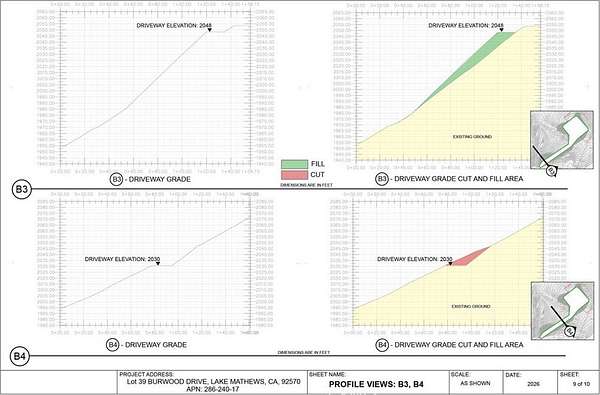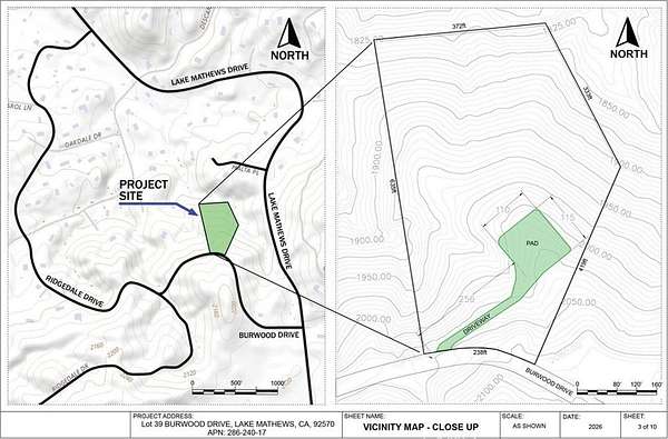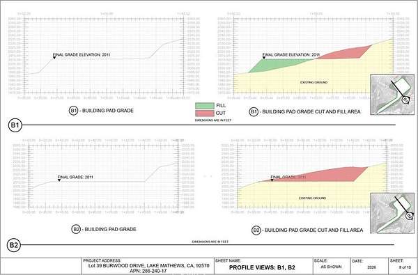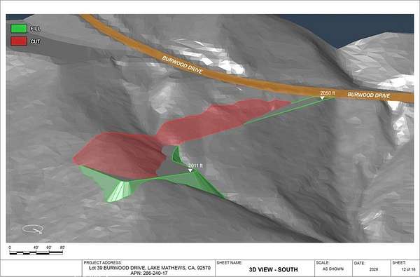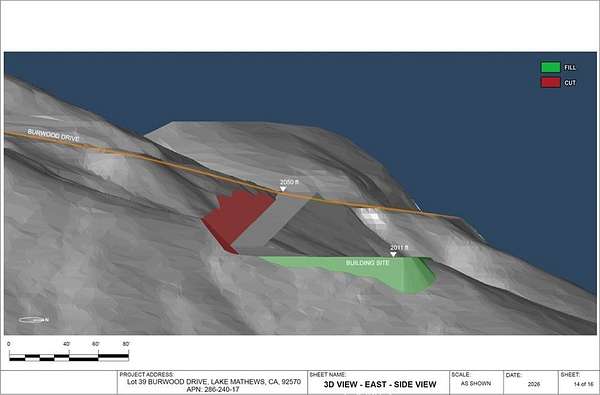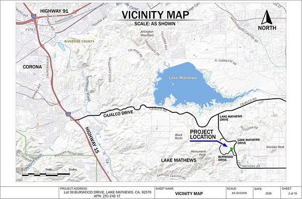 Preliminary engineering grading plans with computer 3D models, calculations and visualizations are included in the purchase. The plans include a 195 feet long driveway, a 115'x110' graded flat pad for a 4000 square feet house and a 4000 square feet garage to store cars, RVs, boats, motorcycles, or any of your toys. No restriction on build type: from luxury mansion through large custom home to a small home, prefabricated homes to mobile homes, Lake Mathews is developer friendly.