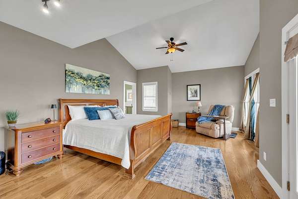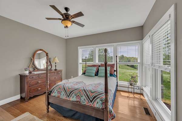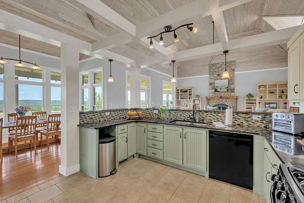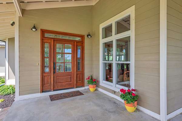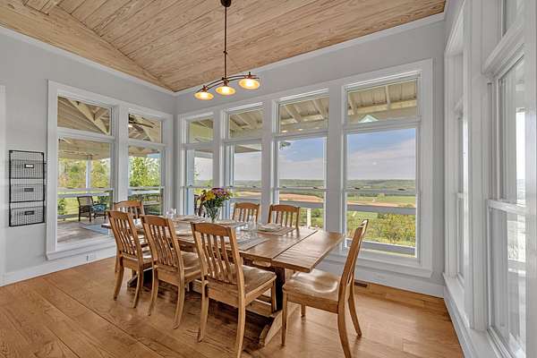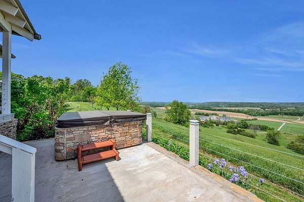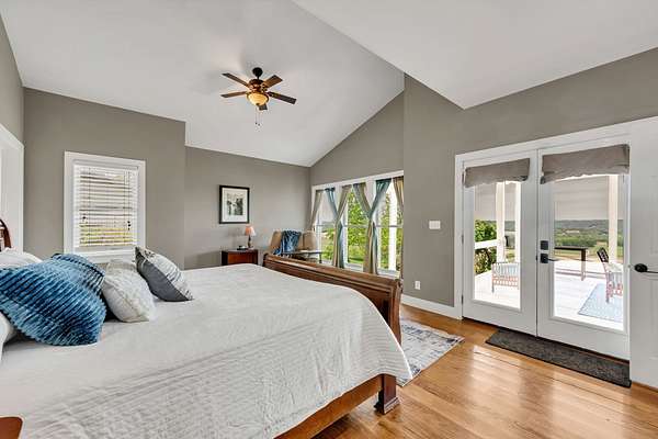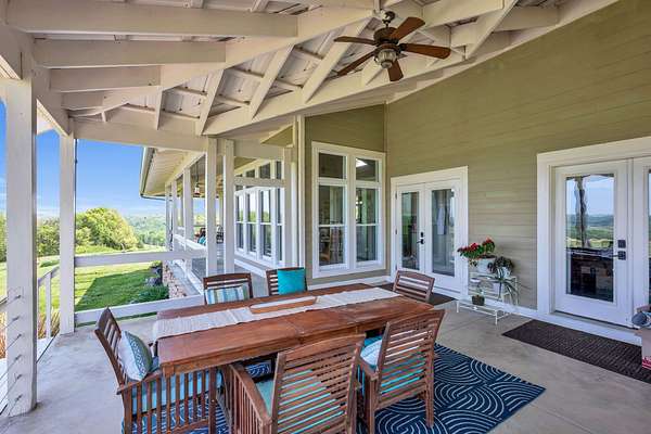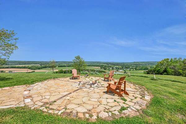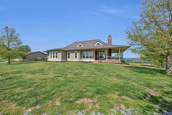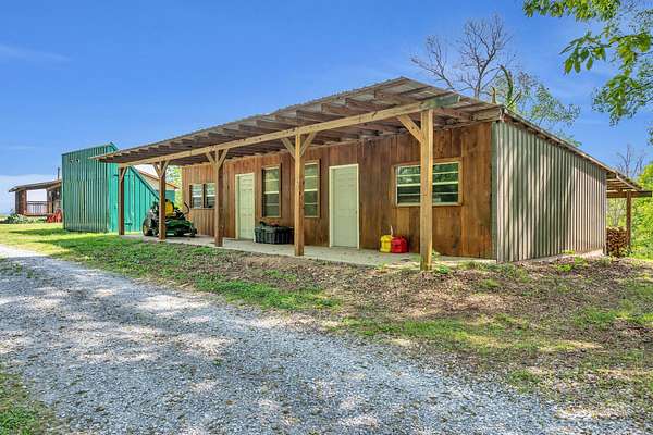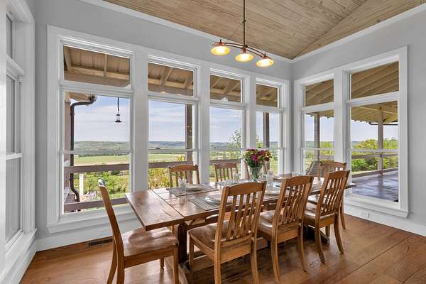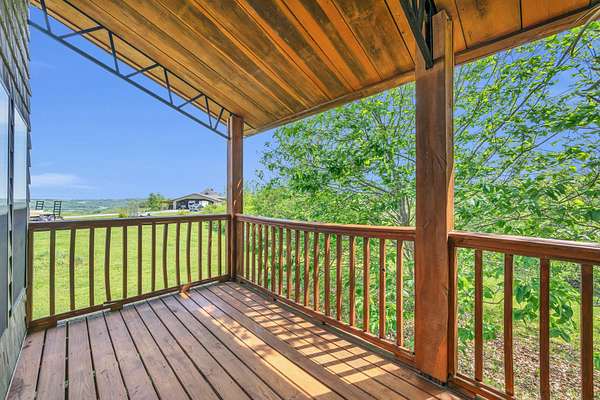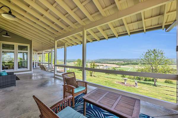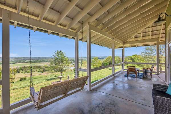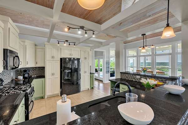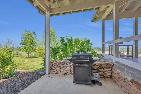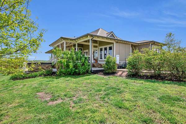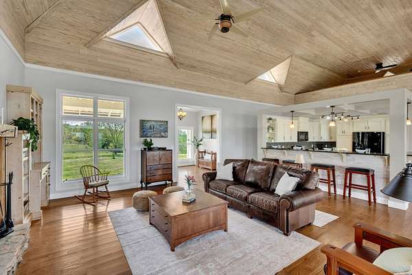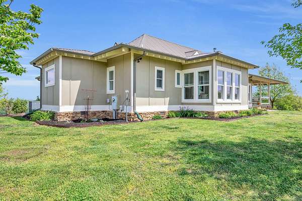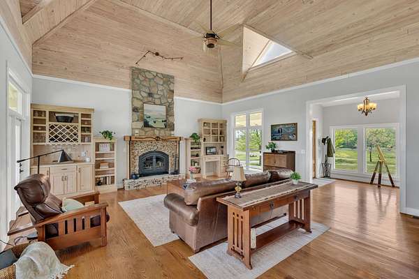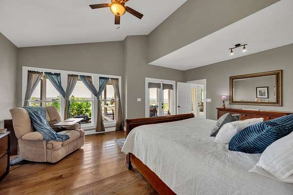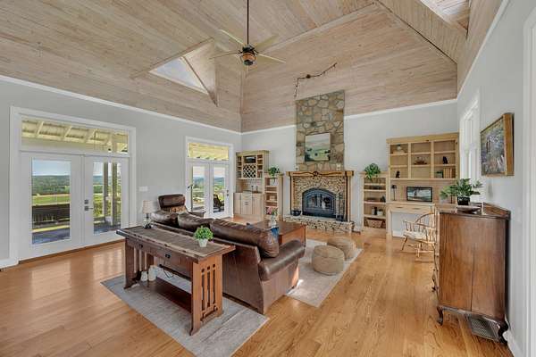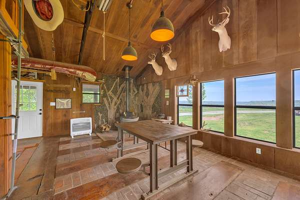 The main residence, a custom-built home, utilizes an open floor plan to capture views from every room. Interior highlights include hardwood floors, a stone woodburning fireplace, and a chef’s kitchen featuring granite countertops. A flexible study serves as a third bedroom while a spacious upstairs bonus room provides additional living space. The primary suite functions as a private retreat with dual vanities, a soaking tub, and walk-in closets (one equipped as a storm shelter).