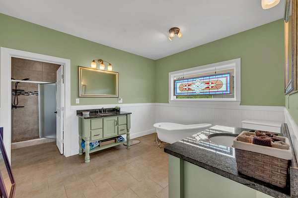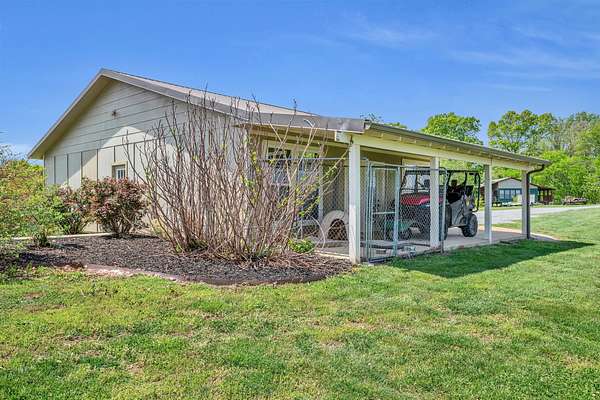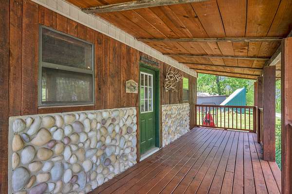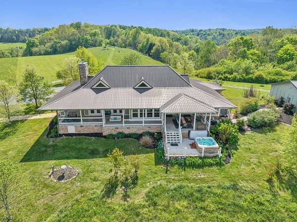 Residents can enjoy an expansive wrap-around porch, stone walkways, a dedicated fire pit area, and a hot tub. The property includes a large detached garage equipped with 30-amp RV service.