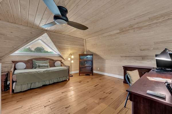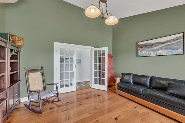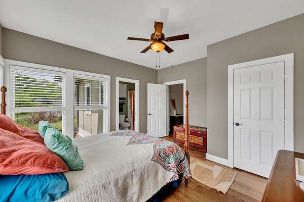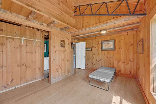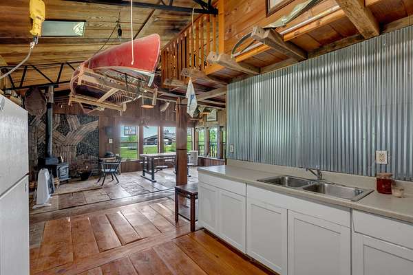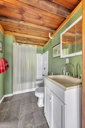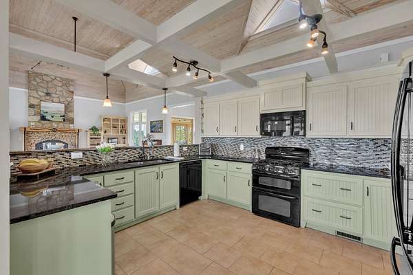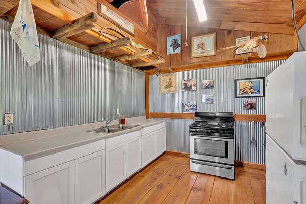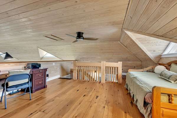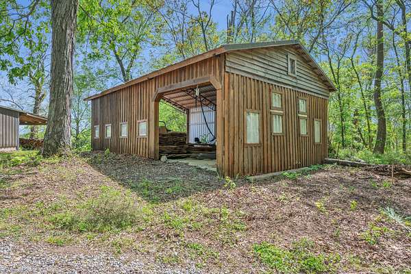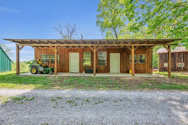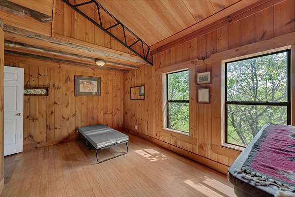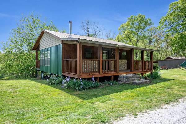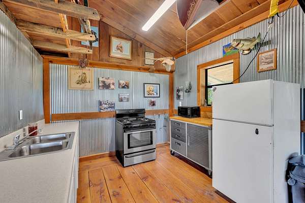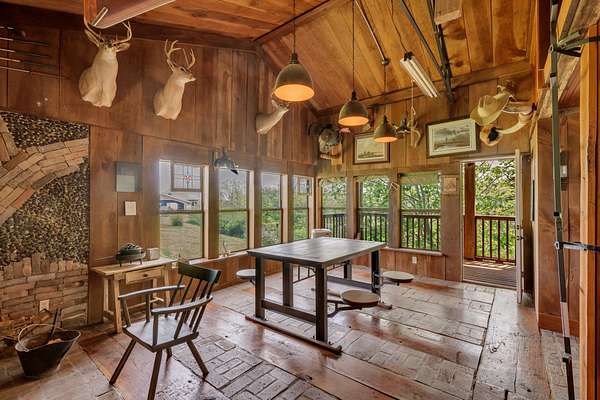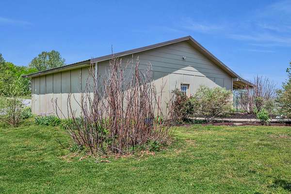 A charming independent cabin (900 sq ft) provides a full kitchen with a gas range, a wood stove, and a loft. This secondary dwelling includes an on-demand water heater and its own septic system. The surrounding grounds comprise an edible paradise filled with an apple orchard, peach and fig trees, blueberry bushes, and various native berries.