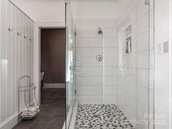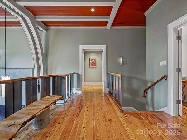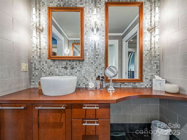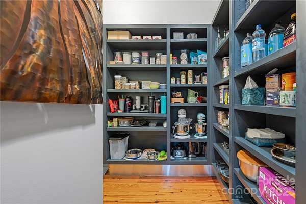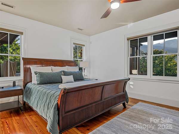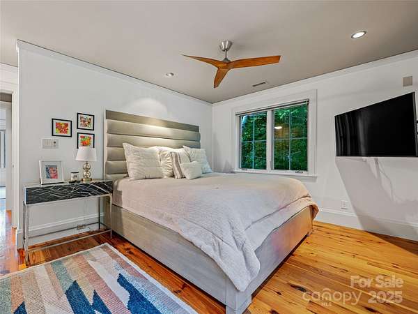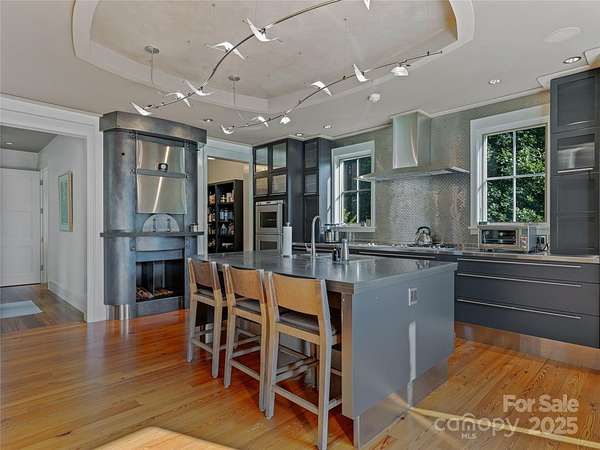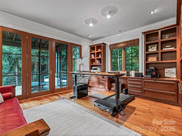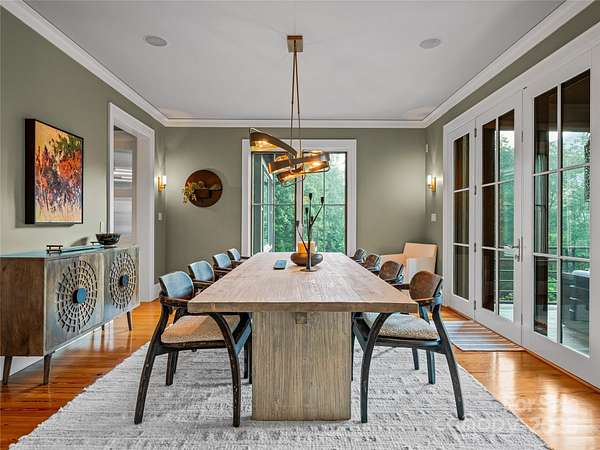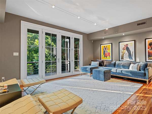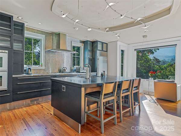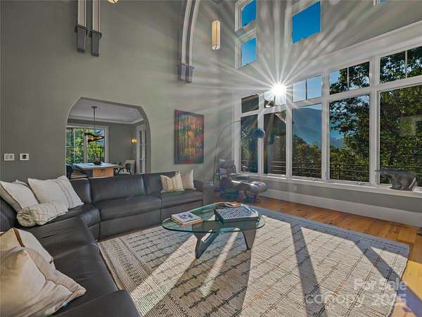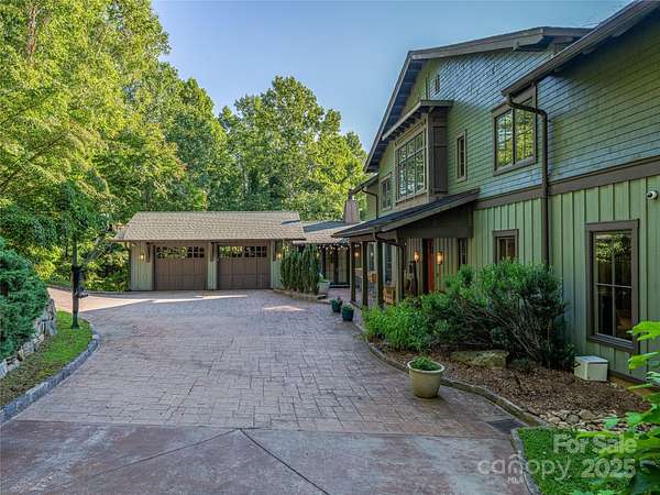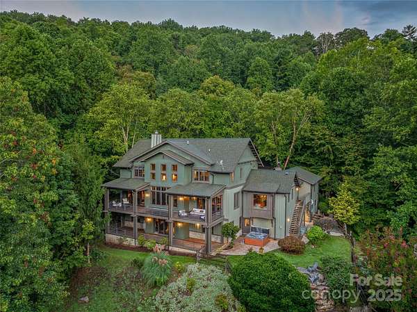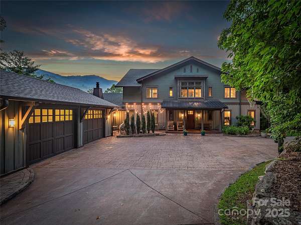 Experience refined mountain living in this 6,000 SF contemporary estate on 5.5 private acres in the sought-after Oxbow Crossing community within Ox Creek. The home features soaring ceilings, walls of glass, custom-designed metalwork, and panoramic mountain views. Thoughtfully planned, the house is both elevator-ready and offers flexibility for a main-floor primary suite. The main floor features a showpiece chef's kitchen with Gaggenau double ovens and range, Sub-Zero refrigerator, EarthStone wood-burning pizza oven, Miele coffee station, custom cabinetry, soapstone and stainless steel countertops, and a very spacious walk-in pantry. The living and dining areas open to a covered deck ideal for al fresco gatherings. A media room, generous office space, powder room, and a large en suite bedroom finish off the main level. The office and large ensuite bedroom offer the flexibility to be combined into a main-floor primary suite. Upstairs, the open hallway overlooks the living room with grand mountain views. The primary suite offers a spa-inspired bath, soaking tub, walk-in shower, double vanities, and custom closet, joined by two additional large ensuite bedrooms a sitting room/craft room or office and a full laundry room. The daylight lower level includes a second large living area, a guest suite with a full bathroom and storage, a family/billiards room, a large custom bar, a gym, and an oversized woodshop. Smart systems include Gigabit Ethernet, three-zone HVAC, dual tankless water heaters, propane heat, a whole-house generator, and an EV-ready two-car garage. Located just minutes from downtown Weaverville and the Blue Ridge Parkway, this exceptional estate blends privacy, sophistication, and modern mountain design.