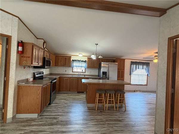 welcome to this 3 bedroom, 2 full bath Doublewide located on 3.02 beautiful and quiet acres. The house sits back off the road, with wrap around deck with ramp. The sunroom off the side deck takes you into mudroom/laundry room, step into the living/family room with sliding glass doors that take you to the back deck and fenced in area for your furry friends.. This unique open floor plan places the beautiful large eat-in Kitchen between the family/living/dining rooms. This home has plenty of room to enjoy family gatherings and so much more. 3 large bedrooms, one with main bath with garden tub and shower, separate full bath and lots of closets and storage space. Many updates such as new carpets and flooring throughout, new water heater and pump, new motor for the furnace. There is a 2 car + garage put in 2023, separate barn/chicken coop and small shed in the woods. This is a must see property, OH and don't forget about the pond behind large red barn. Make your appt. today!!