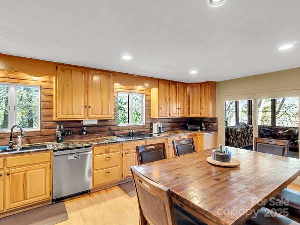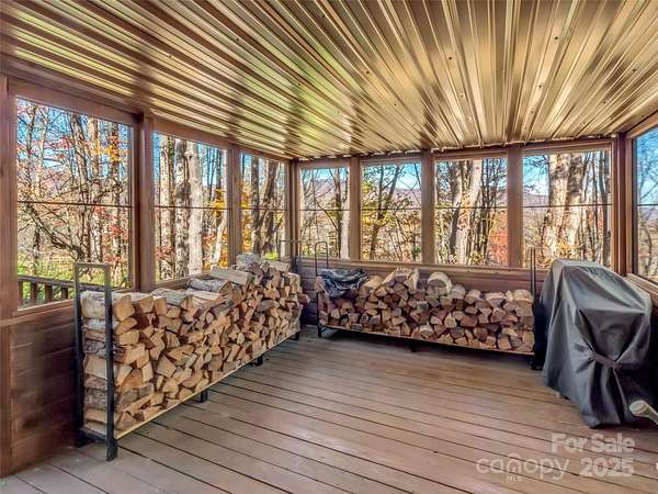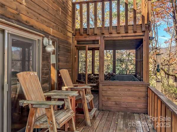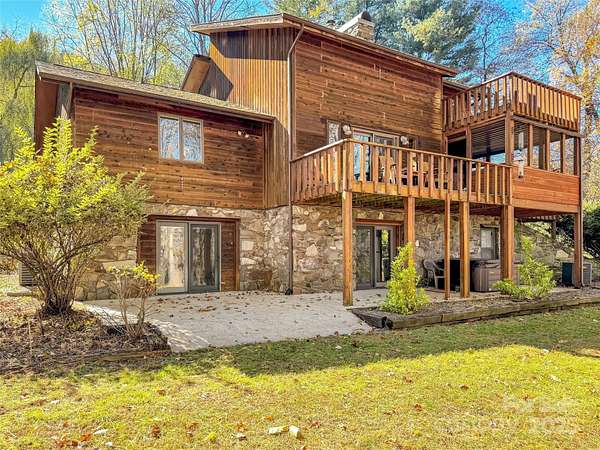Nestled on approximately two private, wooded acres, this contemporary mountain retreat perfectly balances modern comfort with the tranquility of a lodge setting, while still being close to town. Designed for effortless mountain living, the 1.5-story home offers a flat, usable yard and no HOA restrictions. A paved driveway leads to the attached two-car garage and a spacious covered carport, providing ample parking and versatility. Step inside to a bright and inviting living area highlighted by vaulted ceilings, a grand stone chimney, and a cozy wood stove - an ideal setting for quiet evenings or lively gatherings. Outdoor living abounds with a screened porch and three open-air decks, each offering peaceful forest views and fresh mountain air. The upper level features additional living space and a generous primary suite complete with private deck access, a walk-in closet, and an ensuite bath. The finished daylight basement presents exceptional flexibility with its own entrance, full bath with soaking tub, and a bonus room perfect for a gym, studio, or guest suite. With abundant character, thoughtful design, and built-in wellness amenities, this property captures the essence of modern mountain living-private, peaceful, and full of possibility.