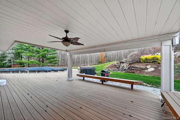 Welcome to 390 Nelson Road - a custom-built Cape Cod retreat offering over 4,856 square feet of living space, set on a stunning 6.5-acre property that borders the serene beauty of protected state park land. From the moment you arrive, you'll be captivated by the charm of this home's classic design and peaceful setting. A picturesque water fountain welcomes you at the entrance, setting a tranquil tone and enhancing the property's sense of privacy and natural harmony. Mature trees, manicured lawns, and perennial gardens surround the home-inviting you to slow down and enjoy the beauty of the Hudson Valley lifestyle. Imagine relaxing on the wide front porch with your morning coffee, taking in the sounds of birds and the gentle rustling of the trees. Step inside and experience craftsmanship and comfort at every turn. The first floor boasts newly refinished hardwood floors and a thoughtfully designed layout that perfectly balances open living spaces with intimate gathering areas. The spacious family room welcomes you with a stately fireplace framed by a custom mantel, while the pellet stove adds a touch of warmth on cool evenings. Elegant crown molding and chair rails added to the home's refined charm. The chef's kitchen is a true centerpiece-featuring wood cabinetry, granite countertops, a large center island, and radiant tiled floors. Whether you're preparing a casual breakfast or hosting a gourmet dinner, this kitchen provides both beauty and function. The sunny eat-in area opens onto a spacious covered deck, ideal for entertaining or simply enjoying peaceful mornings surrounded by nature. The formal dining room and living areas provide a perfect setting for holiday gatherings or quiet evenings at home, with seamless flow and abundant natural light throughout. Work at home in your private main-floor office or study. The second floor features four spacious bedrooms, all with hardwood flooring, walk-in closets, and custom built-in shelving, a main bath, and a laundry room.. The primary suite is a true private sanctuary, featuring a gas fireplace and a beautiful coffered ceiling. The en-suite bathroom feels like a spa, with a whirlpool tub, a separate glass-enclosed shower, double vanities, radiant heat, and custom tilework. Sliding doors open to private decks, blurring the line between indoor luxury and outdoor serenity. Above the oversized three-car attached garage, you'll find a bonus room. This flexible space offers endless possibilities! The property also includes a single detached garage and multiple storage areas, ideal for tools, lawn equipment, and recreational gear. Step outside to your own backyard oasis, featuring a pool, expansive deck, a hot tub, and lush landscaping that make every day feel like a getaway. With open fields and wooded trails, the land provides plenty of room for outdoor activities-bring your horses, garden, or simply enjoy the space and serenity. Located just one hour from New York City, this home combines country tranquility with suburban convenience. Enjoy easy access to the town beach, the Appalachian Trail, apple orchards, local wineries, charming shops, fine dining, and top-rated schools. This home offers the perfect blend of privacy, elegance, and comfort-an extraordinary home where every detail has been designed for relaxed living and timeless enjoyment. Don't miss this rare opportunity to own a true Hudson Valley gem.