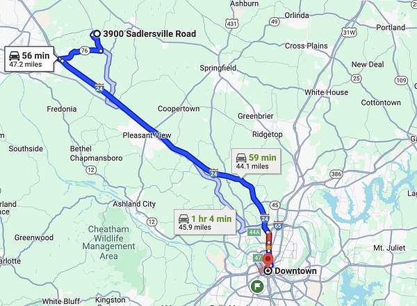 1-24 W toward Clarksville Take exit 11 for TN-76 E toward Adams Keep Right at the fork, follow signs for Adams/TN-76 E Merge ontoTN-76E/M.L.K. Jr Pkwy E Slight Left onto Old Clarksville Springfield Rd Turn Left onto TN-238 N Turn Right onto Sadlersville