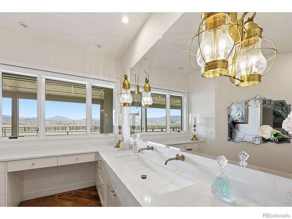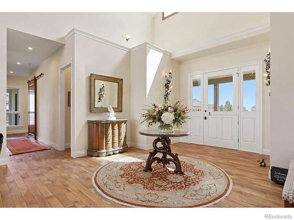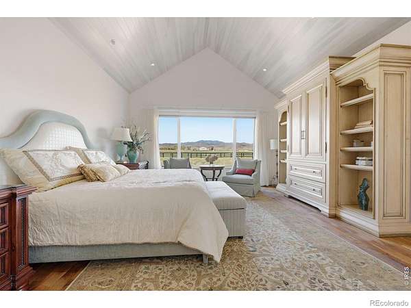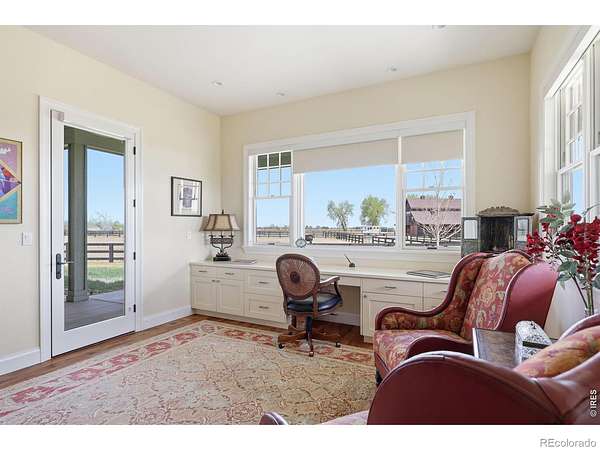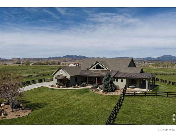 Whitecap Haven. A rare pastoral retreat where refined design meets the quiet beauty of the countryside. From the moment you arrive, a welcoming front porch sets the tone for a home that is both elegant and deeply inviting. Inside, soaring beamed ceilings and a dramatic wall of glass frame breathtaking whitecap mountain views, creating a stunning backdrop that carries throughout the home. The great room is warm and expansive, anchored by a gas fireplace, rich wood floors, and an effortless open-concept flow. The kitchen is thoughtfully designed for both everyday living and elevated entertaining, featuring premium appliances, a warming drawer, sunlit breakfast nook, and barn doors that reveal a generous walk-in pantry. A versatile secondary bedroom offers custom built-ins ideal for a home office, with direct access to the wraparound patio and a Jack-and-Jill bath connecting to an additional spacious, light-filled bedroom. The primary suite is a private sanctuary, complete with high ceilings, large picture windows, patio access, and a sumptuous, spa-inspired bath. The walk-in closet conveniently connects to the laundry, blending luxury with everyday ease. An oversized two-car garage with epoxy floors and a dedicated workshop caters to both hobbyists and storage needs. Outside, new fencing and a newly installed driveway enhance both function and curb appeal. Perfectly positioned near Berthoud, this exceptional property offers the serenity of country living with abundant wildlife, all while remaining close to town. A home where every window captures a view, and every detail has been thoughtfully curated.