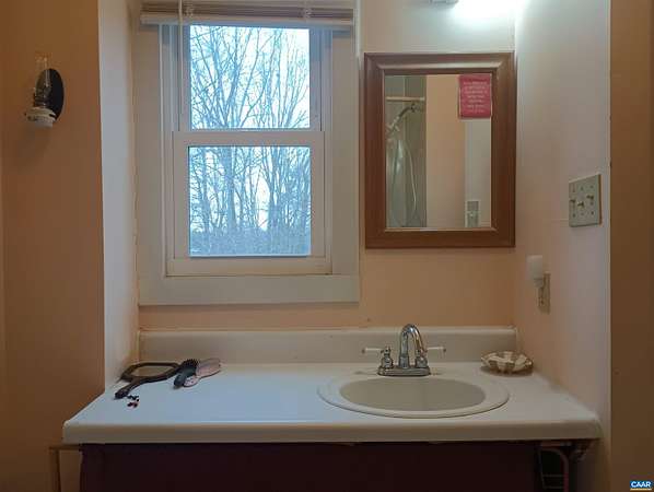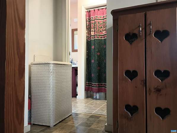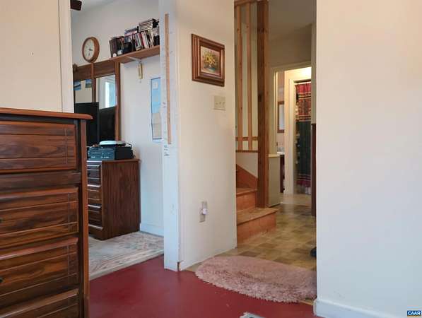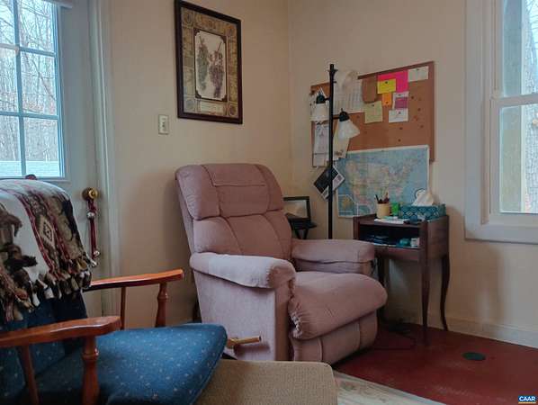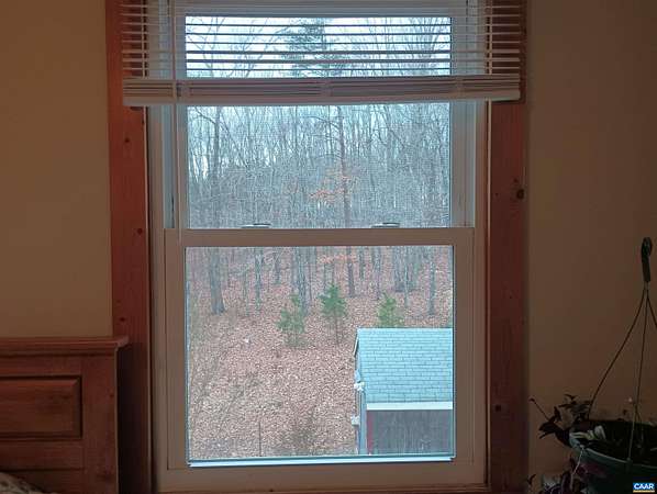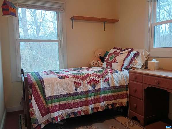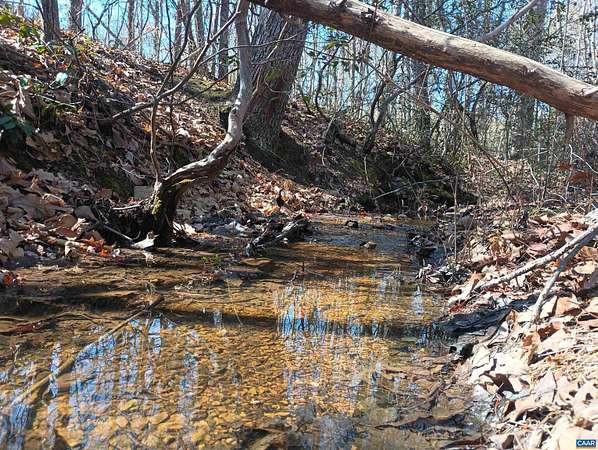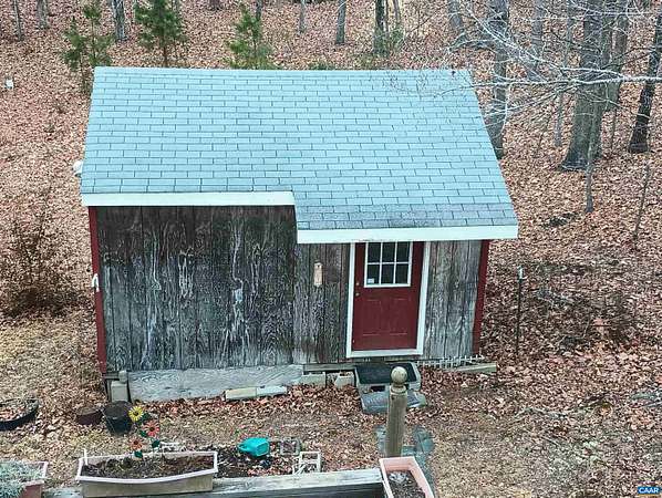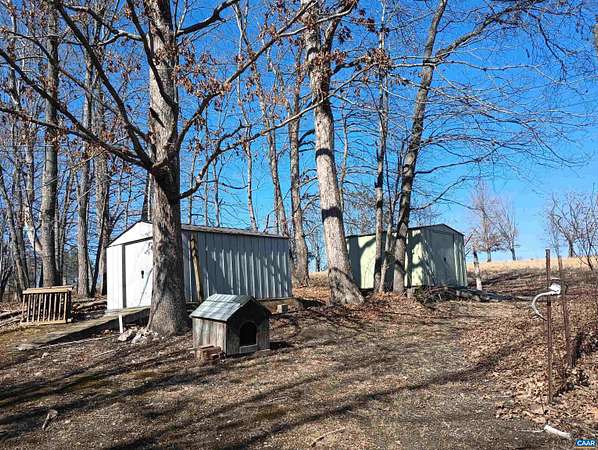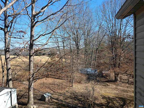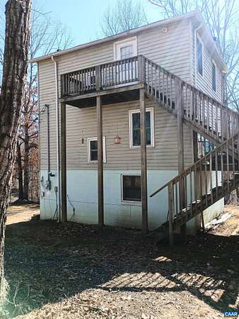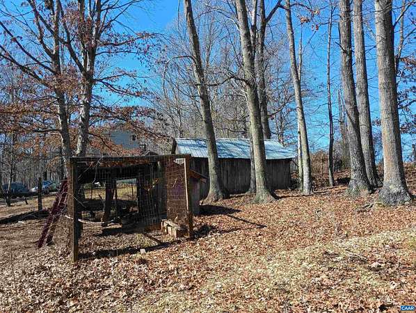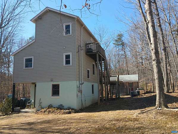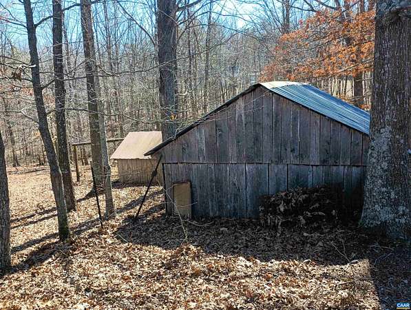 Live the dream on just over 6 acres of land in Buckingham County. This unique 3 story home provides 2 bed, 1 1/2 baths. The woodstove heats the whole house from the den on the 1st floor. Laundry room 1st floor also. Upstairs to the 2nd floor: kitchen & dining area, second bedroom, a small living room and views. Go up to the 3rd floor: large primary bedroom, a half bath, and storage. Both upper floors have doors onto decks that lead down into the yard, with great views of the property and the neighboring fields. 2nd floor deck faces west for viewing sunsets. Front porch faces east, looking down at the barn, chicken coop, the fenced paddock and the wooded area around the creek which attracts deer and other wildlife to watch or hunt. Springs feed into the streams & the small creek that passes through the property. A modern handpump on the well can supply water if no power. A/C is handled by 2 window units. A fenced garden area is in front of the house, and another partially fenced paddock behind the house. A red shed /workshop /studio (11'x15' with power), and two small metal sheds provide extra storage. Only 30 minutes from Lovingston for grocery store etc and less than an hour easy commute to Charlottesville or Lynchburg.