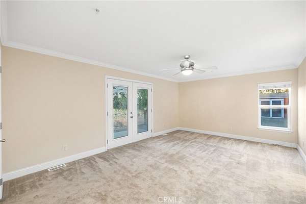 A long, tree-lined cement driveway leads to a custom 4-car garage. The home features an open layout with large windows and doors that bring in natural light and showcase the surrounding scenery. French doors and sliding glass doors offer easy access to a large patio, garden area perfect for relaxing or entertaining.