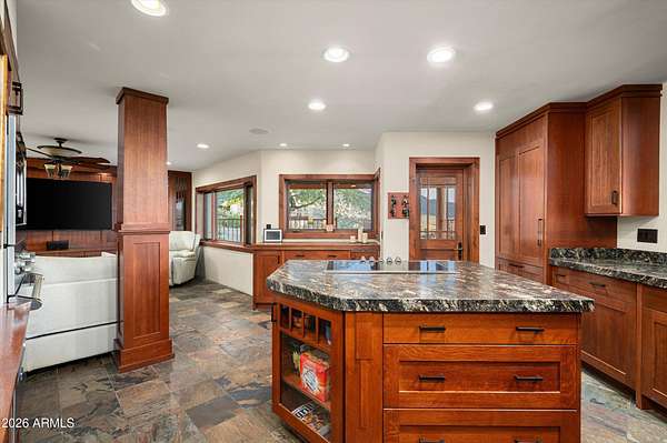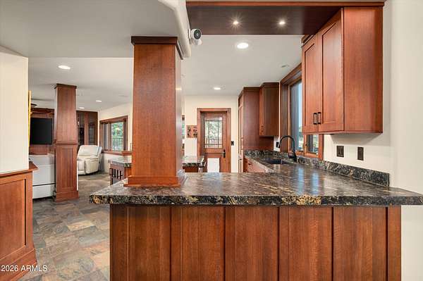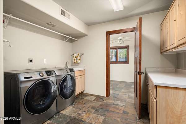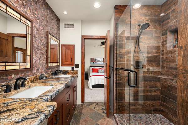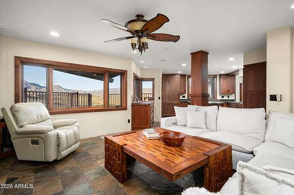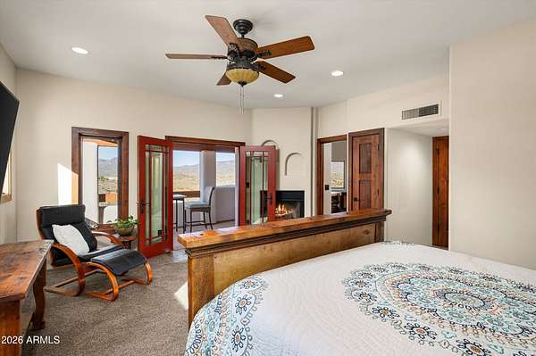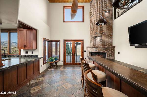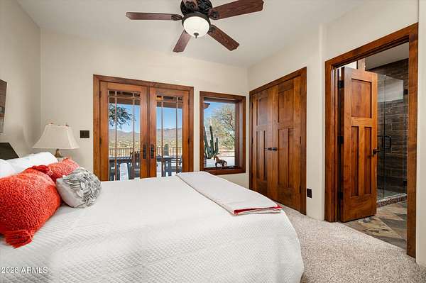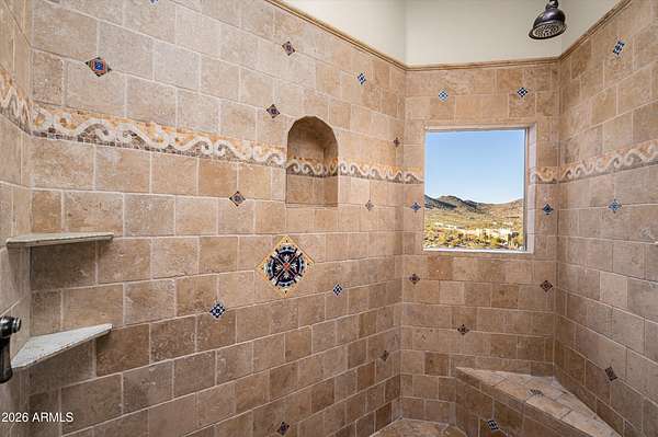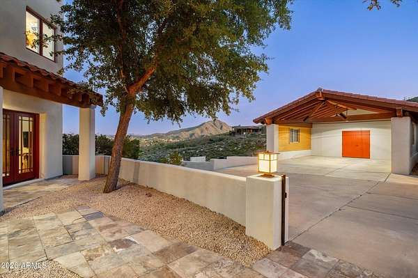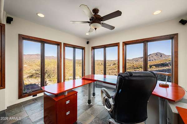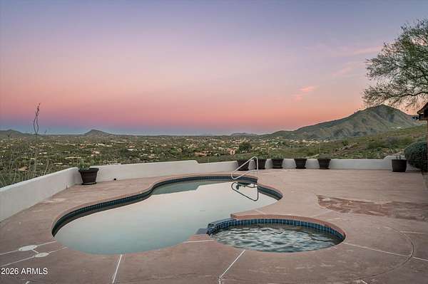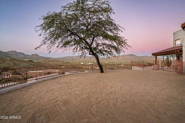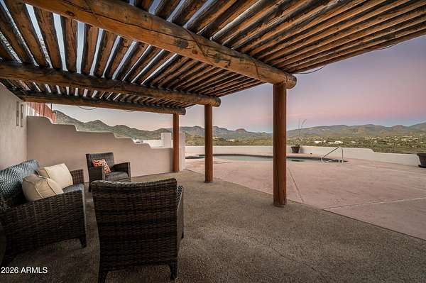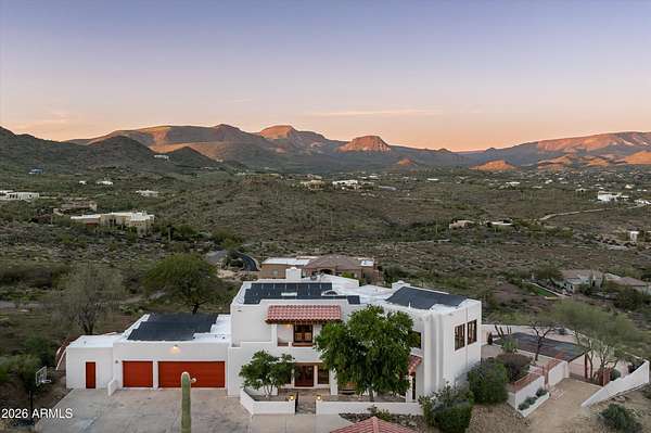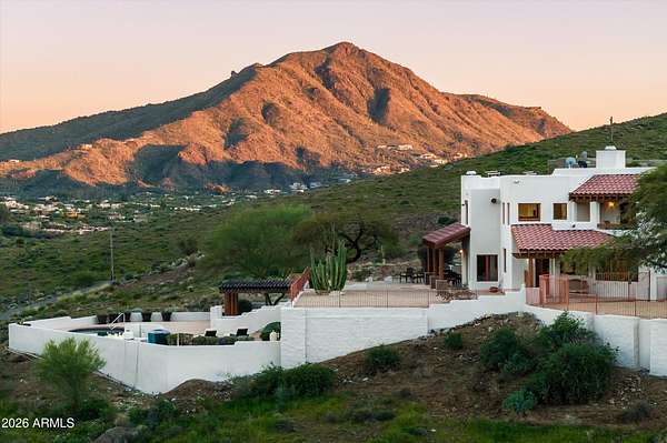Looking for a private desert oasis with breathtaking views? This is the one! Set on 5 acres of hillside terrain, this exceptional estate offers panoramic mountain views along with expansive, flat usable land; ideal for expanding the home, adding a pickleball court, or creating a grassy play area. The thoughtfully designed floor plan provides ample space for everyone, featuring two secondary bedrooms on the main level, one upstairs, and a spacious primary retreat with an office and spectacular views. A loft and bonus room offer additional flexible living space. The kitchen and all bathrooms have been tastefully updated. Entertain with ease in the full bar room with a charming brick fireplace, or enjoy outdoor living with the pool and spa, extended decking, and covered ramada. Parking and storage are abundant with a three-car garage and a two-car detached carport. Additional highlights include a dedicated storage room adjacent to the garage and a secured workshop behind the detached carport.Equestrian enthusiasts will appreciate the four-stall mare motel with turnout and tack room located at the base of the hill. Enjoy lower utility bills with seller-paid solar and the benefit of a private well. Ideally located with easy access to the charming town of Cave Creek, offering dining, entertainment, hiking, and trail riding in nearby preserves. This property is perfect for buyers seeking the peace and tranquility of country living with the convenience of the city close by.