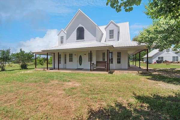 This rural abode offers expansive outdoor space ideal for hosting gatherings or savoring quiet moments in nature. The wraparound porch provides panoramic views of the tranquil landscape, making it a perfect spot for morning coffee or evening relaxation. Enhance your hosting capabilities with a charming 2-bedroom, 1-bath guest house, featuring an open-concept living area that offers versatility as a guest suite, private office, or income-generating rental. The property's character is further enriched by a stunning wood-burning stone fireplace, perfect for cozy evenings.