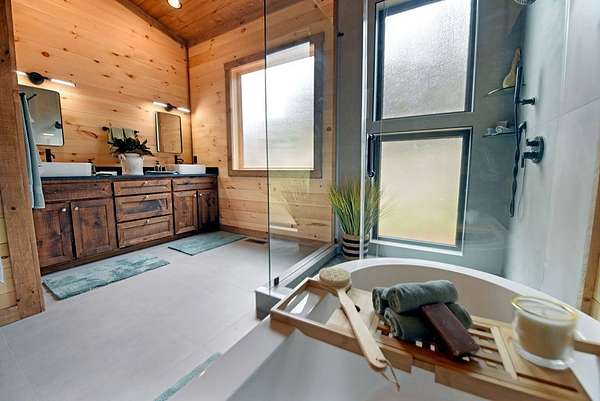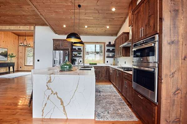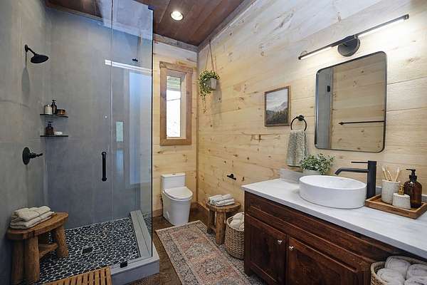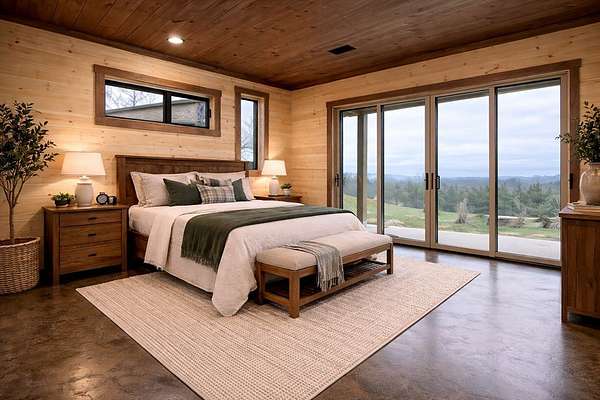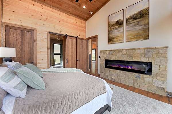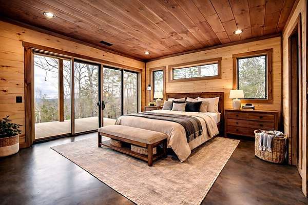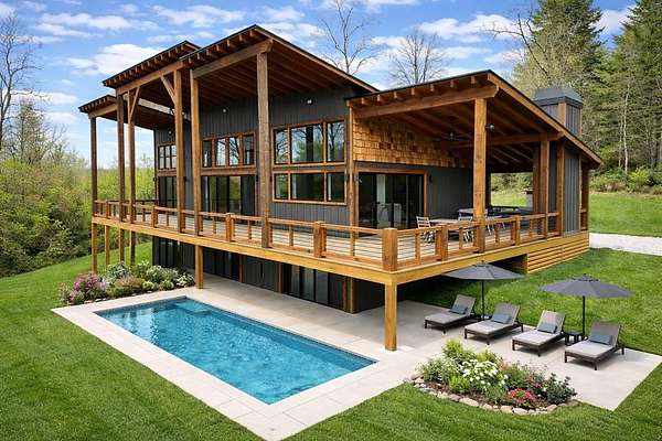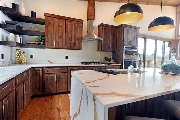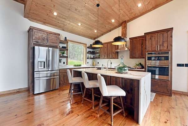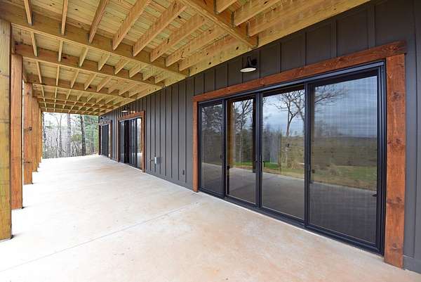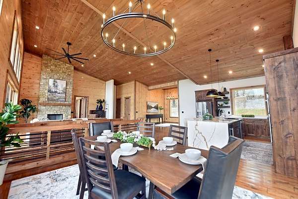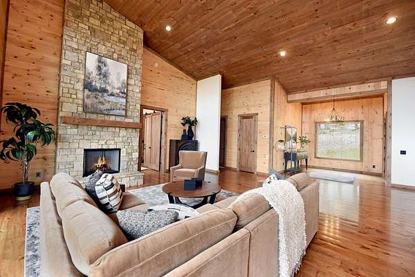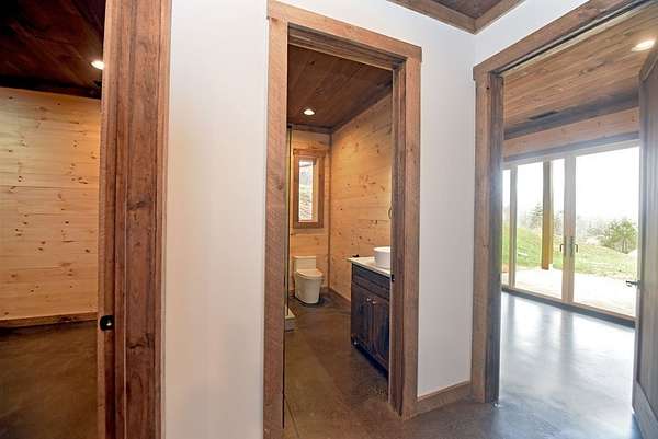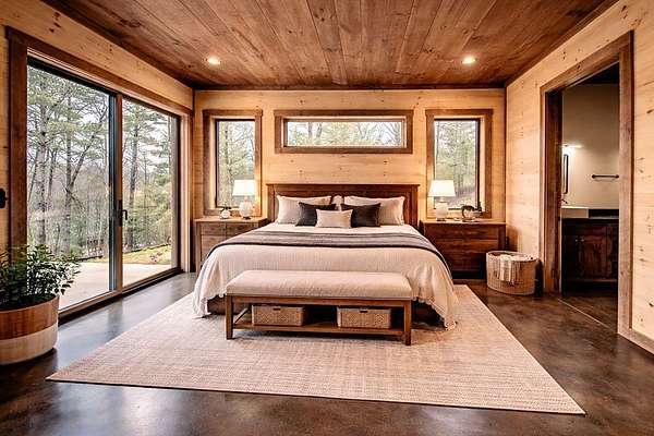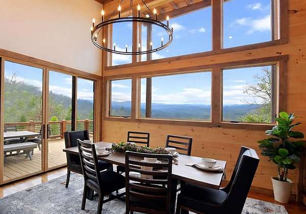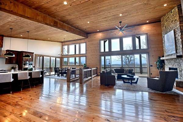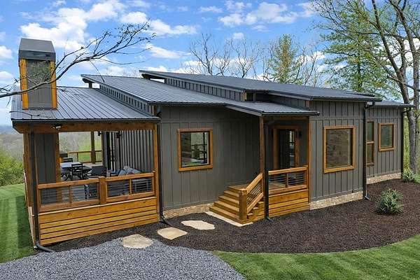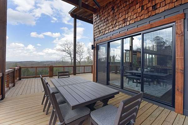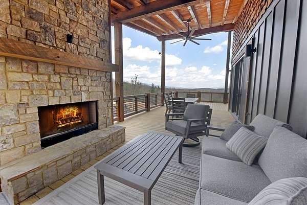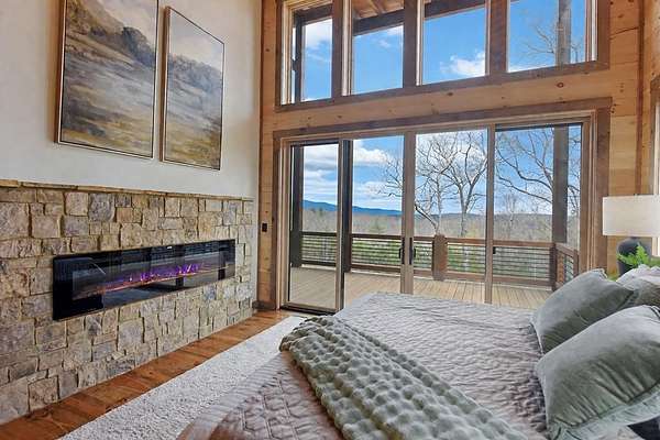 Welcome to a rare blend of sophistication and serenity—an exquisite Mountain Modern retreat nestled on 1.9 gentle acres, just minutes from downtown Blue Ridge. Thoughtfully designed to capture the essence of luxury mountain living, this 4-bedroom, 3.5-bath residence offers an unparalleled sense of peace, privacy, and connection to nature. From the moment you arrive, you're embraced by a quiet, tranquil setting where the beauty of the mountains surrounds you. Inside, expansive walls of windows frame breathtaking long-range views, filling the home with natural light and creating a seamless indoor-outdoor experience. The interior exudes refined elegance, where warm wood tones meet clean architectural lines and upscale finishes. Gleaming hardwood floors flow throughout the open-concept living space, anchored by a stunning gas log fireplace—perfect for both intimate evenings and effortless entertaining. The gourmet kitchen is a true centerpiece, featuring high-end appliances, granite countertops, custom cabinetry, and a spacious walk-in pantry, all overlooking the dining area and great room with uninterrupted mountain vistas. The main-level primary suite is a private sanctuary, capturing sweeping views and featuring a luxurious electric fireplace and spa-like ensuite bath with a walk-in tile shower and soaking tub. Step outside to an expansive deck, where an outdoor fireplace invites year-round enjoyment. The terrace level offers a refined retreat with stained and polished concrete floors, a media lounge, wet bar, and a secondary primary suite. Two additional guest bedrooms share a beautifully appointed, spa-inspired bath filled with natural light. The land is exceptionally level and highly usable—ideal for creating your dream outdoor oasis, whether an inground pool, pickleball court, or putting green. Just 5 miles from downtown Blue Ridge & minutes to restaurants & wineries, this home offers the perfect balance of luxury, comfort, and peaceful mountain living.