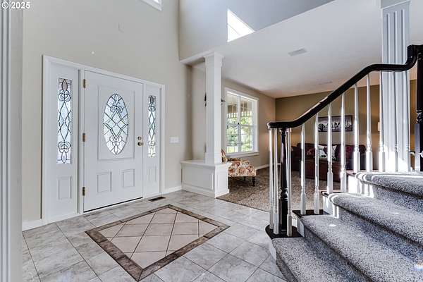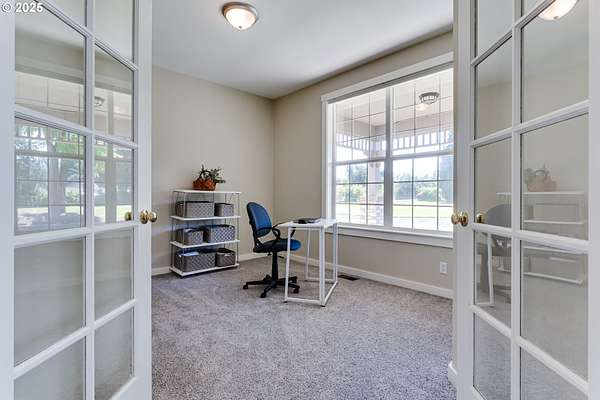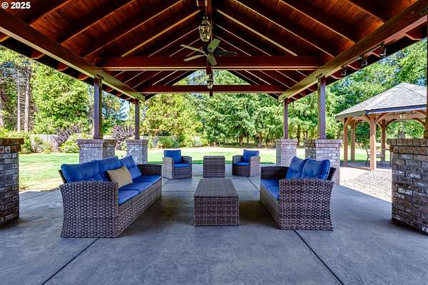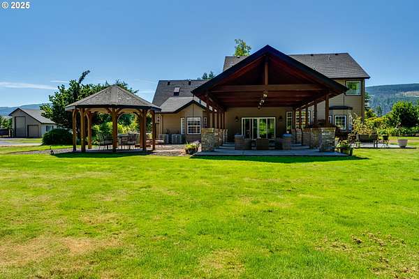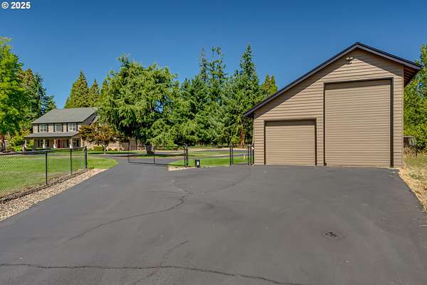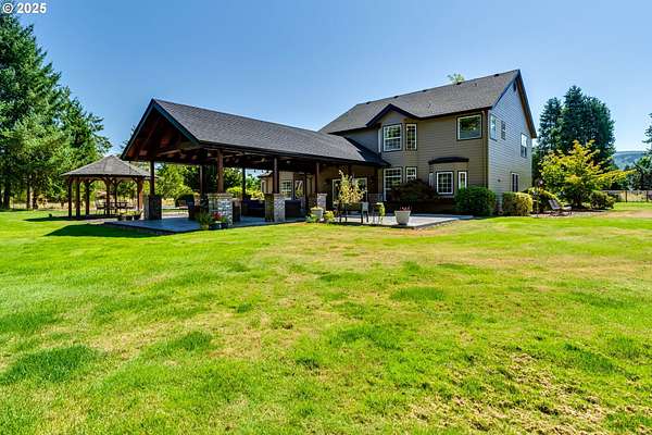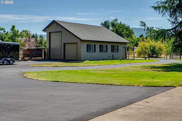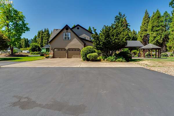 Incredible estate on 2 acres with a large shop near the scenic McKenzie River. Located in a special tucked away hidden gem of a neighborhood in East Springfield. This stunning home features a spacious primary suite with a walk-in closet and spa like bathroom, a versatile den on the main floor, elegant formal living and dining rooms, a gourmet island kitchen with a bright eating area, and a cozy great room with a fireplace. A large main level bonus room next to the great room has so many possibilities and there is also a family room upstairs. Outside, enjoy abundant blueberry plants and a custom built covered patio for an incredible outdoor living space.This covered patio couldn't be more perfect for large gatherings of family and friends and has the possibility to add an outdoor kitchen or TV viewing area. The 20x40 drive-through shop is ideal for storage of RV's, several boats, wood working shop etc. The yard is fenced with an electric gate and is all nestled in a tranquil, private setting that perfectly blends rural charm with modern convenience.