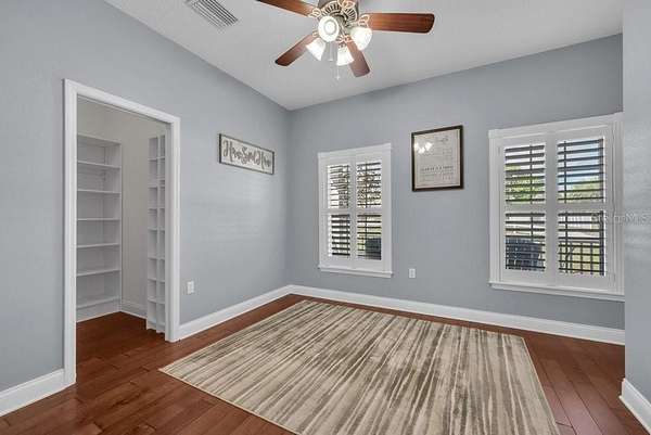 - Built-In Features, Crown Molding, Eat-In Kitchen, High Ceilings, Open Floorplan, Primary Bedroom Main Floor, Solid Surface Counters, Thermostat, Walk-In Closet(s), Window Treatments