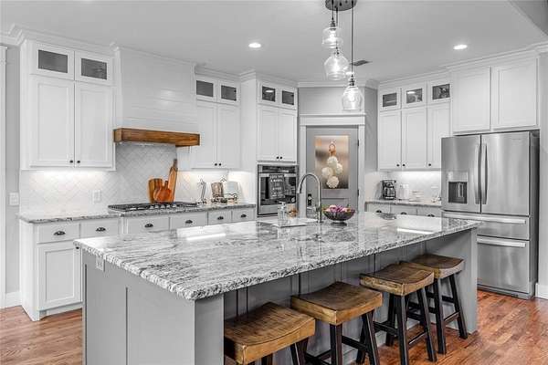 The well appointed kitchen boasts modern amenities, a large walk-in pantry and an elegant design that flows into the dining and living areas, while a conveniently located half bath is available for guests.