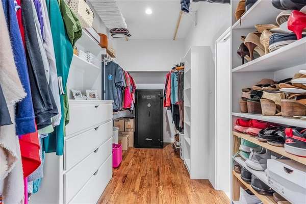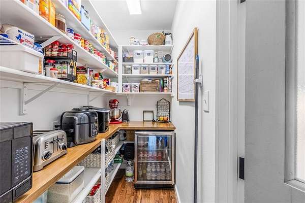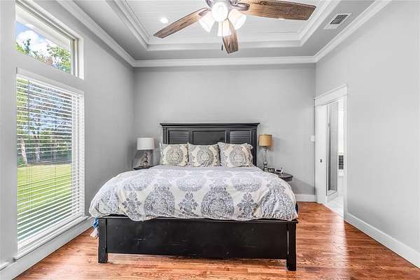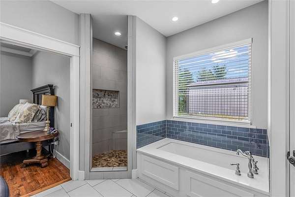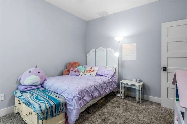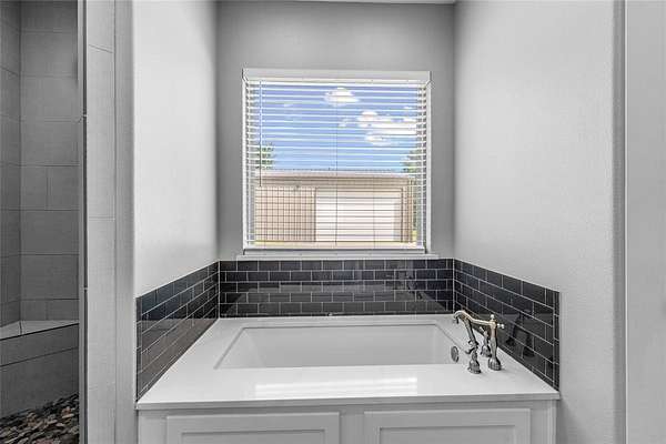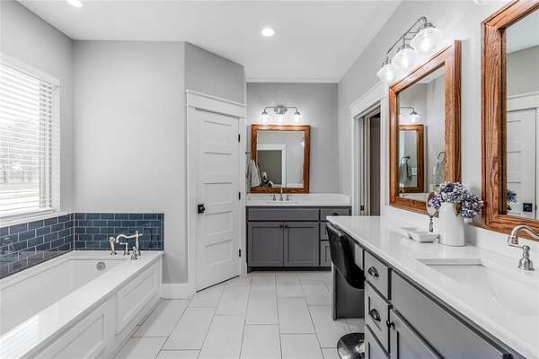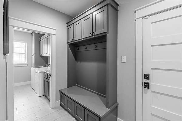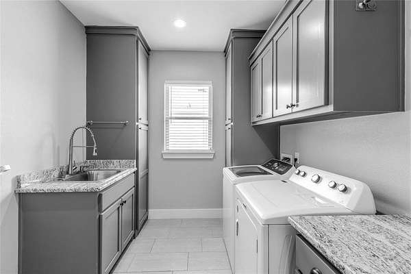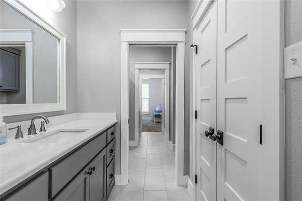 The spacious primary suite is a retreat in itself, featuring an en-suite bathroom with dual vanities, a garden tub, a walk-in shower, and a large walk-in closet with custom built-ins. Thoughtfully designed, the suite connects directly to the utility room, which includes a built-in sink and custom cabinetry for added convenience.