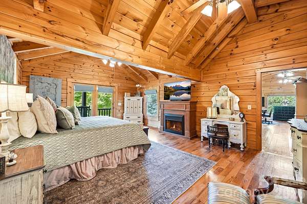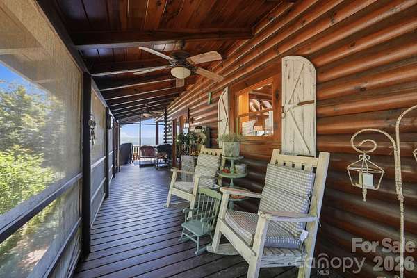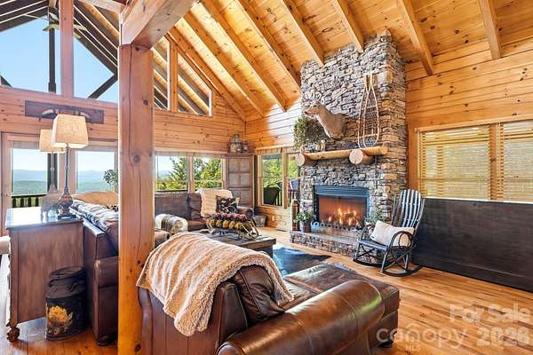 Perched high above the Blue Ridge landscape in the gated community of High Peak Mountain Estates, this extraordinary mountain retreat offers the kind of views most people only experience on scenic overlooks. From sunrise hues to unforgettable sunset skies, the long-range mountain vistas create a breathtaking backdrop for everyday living. Designed to capture both comfort and connection to the outdoors, the home features soaring cathedral ceilings and expansive windows that fill the open-concept living spaces with natural light while framing the mountains beyond. A dramatic rock fireplace anchors the main living area, creating the perfect gathering space after a day exploring the mountains. With approximately 4,100 square feet, this thoughtfully designed home offers 3 bedrooms and 3 baths, including convenient main-level living with a bedroom and laundry on the main floor. Upstairs, the spacious primary suite serves as a private retreat complete with a freestanding electric fireplace, spa-inspired bath with jacuzzi tub, dual vanity, and walk-in shower. A loft overlooking the living area provides flexible space for an office, reading nook, or additional lounge area. The home was built with entertaining in mind. The finished lower level features a large recreation room with fireplace, a bar area with kitchenette, and an additional bedroom and full bath with sauna. With the pool table included, it's an ideal setting for hosting friends and family. Outdoor living is equally impressive. Three covered decks, including a screened porch and a private balcony off the primary suite, offer multiple spaces to take in the surrounding landscape. Enjoy evenings in the eight-person hot tub, gather around the fire pit under the stars, or relax while surrounded by thoughtfully curated landscaping featuring vibrant flowering plants, mature trees, and seasonal blooms throughout the property. The seller has invested in numerous improvements including a new concrete driveway, refreshed decks, copper porch accents, upgraded lighting, new kitchen appliances, updated bathrooms, and interior enhancements that add both style and functionality. Short-term rentals are permitted, offering exceptional flexibility whether you're searching for a private mountain escape, full-time residence, or investment opportunity.