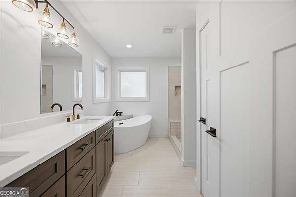 - Double Vanity, Master On Main Level, Separate Shower, Soaking Tub, Split Bedroom Plan, Tile Bath, Walk-In Closet(s)