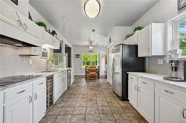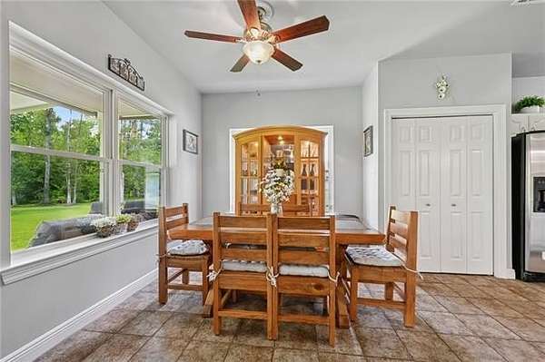 Outdoors, you'll find a half bath conveniently located off the back patio, ideal for outdoor activities or guests. Located in Flood Zone X, this home offers both comfort and security in a tranquil setting.