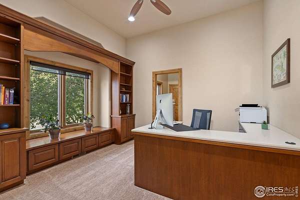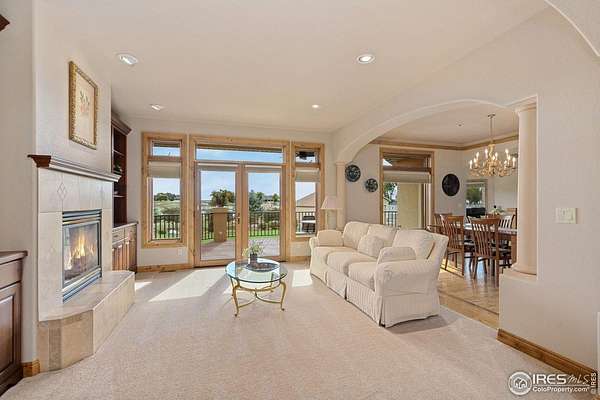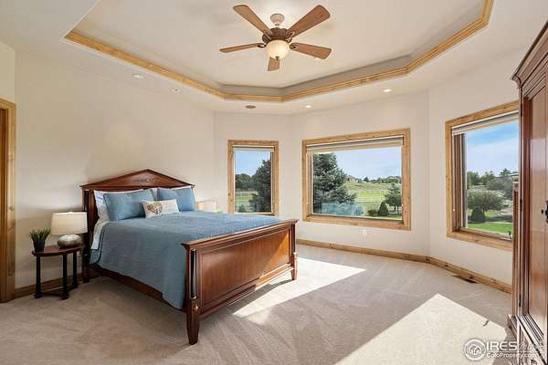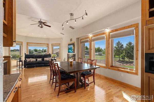 Located on over 5 acres in a gated cul-de-sac community, this property combines quality craftsmanship with superb maintenance. The home features hardwood inlay floors, arched doorways, solid wood doors, and abundant windows showcasing mountain and plains views. The finished walkout basement includes a wet bar, fireplace, and flexible living space, and the primary bathroom offers heated floors for comfort. Outdoor living is maximized with multiple patios and decks, mature landscaping with LED night lighting, and HOA-provided irrigation for crops or pasture. The barn is equipped with box stalls and a heated shop, ideal for equestrian or hobby use, with direct access to community horse trails, arena, and pedestrian paths. The garage is fully finished with epoxy flooring, and the home's condition reflects true pride of ownership-single owner, meticulously maintained, and move-in ready. Every window captures a view, creating a bright and inviting interior throughout. This property offers an exceptional combination of amenities: equestrian facilities, gated privacy, extensive outdoor spaces, and a residence that lives like a show home. A rare opportunity in a premier setting.
