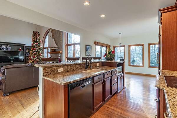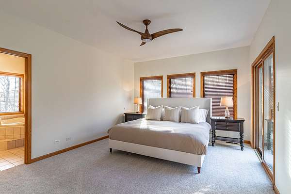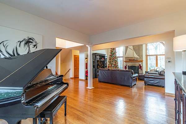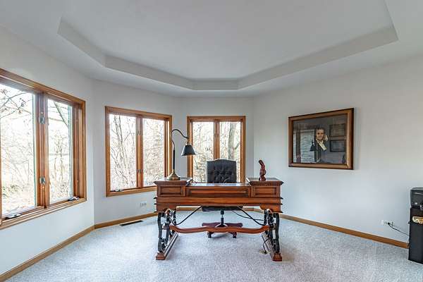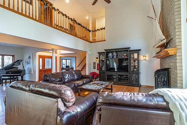 Welcome to this exceptional and beautifully maintained 4-bedroom, 3.1-bath residence, perfectly situated on a serene and expansive 2.24-acre lot offering water rights, a private water launch, and the freedom of no HOA or bylaws. This property effortlessly combines space, privacy, and lifestyle amenities, all complemented by a spacious 3-car garage. As you step inside, you are greeted by a grand two-story living room that immediately sets the tone for the home. The soaring ceilings, abundant natural light, and striking brick fireplace create a warm yet grand atmosphere, ideal for both everyday living and memorable gatherings. The heart of the home is the generously sized kitchen, thoughtfully designed for functionality and entertaining. It features ample cabinetry, a breakfast bar /island perfect for casual dining or hosting guests, and a convenient butler's pantry that provides additional storage and prep space. Adjacent to the kitchen, the dining area offers a seamless flow and direct exterior access to the brick paver patio, making indoor-outdoor entertaining effortless. The main-level primary suite is a true retreat, offering comfort and privacy. This spacious bedroom boasts vaulted ceilings, a walk-in closet, and private access to the patio, perfect for enjoying peaceful mornings or relaxing evenings. The ensuite bathroom is equally impressive, featuring a double vanity, a separate shower, and a luxurious whirlpool tub designed for relaxation. Rounding out the main level are a dedicated office ideal for remote work or study, a convenient half bath for guests, and a well-appointed laundry area that adds to the home's practicality. The second level features three generously sized bedrooms, each offering ample closet space and natural light. A full hallway bathroom serves this level, along with an additional storage room that provides flexibility for seasonal items or extra organization. The lower level expands your living space even further, offering a recreational area perfect for entertaining, movie nights, or a home gym. This level also includes a full bathroom and abundant storage space, ensuring all your needs are met. Step outside to enjoy the impressive outdoor features, including a brick paver patio ideal for gatherings, a relaxing hot tub, and expansive grounds that offer endless possibilities for recreation, gardening, or simply enjoying the surrounding nature. The property's proximity to forest preserves and parks enhances its tranquil setting, while still being conveniently located near everyday amenities. Adding even more appeal, the home is located within a highly sought-after 9/10 rated high school district. This remarkable property offers a rare combination of space, privacy, water access, and modern comfort, an opportunity not to be missed.