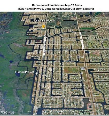 Great development opportunity. One of the few commercial land assemblages on Old Burnt Store Road, with a direct connection on Kismet Pkwy W to Burnt Store Road. The CAC future land use district and NC Neighborhood Commercial Zoning allow free standing commercial development up to 1 FAR, free standing multi-family for 15 to 85% of the Property with a density of between 12 to 16 du/acre and compound mixed use buildings up to 2 FAR. Less than 2 miles north of the Seven Island development. NW Cape affords direct boating access to residents and has some of the highest household incomes in the City. The N3 utilities scheduled to be in place by 2028. More information available upon request.