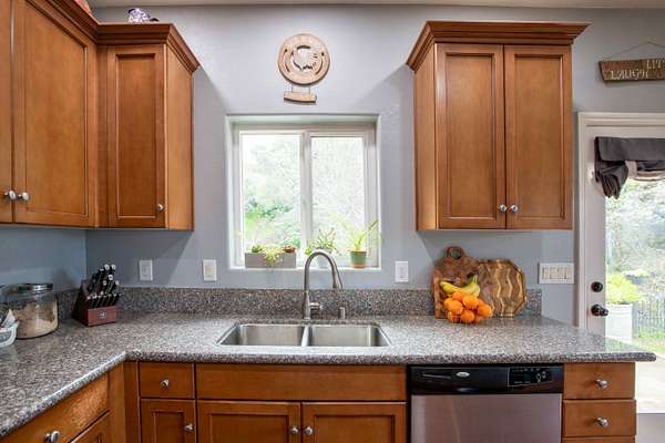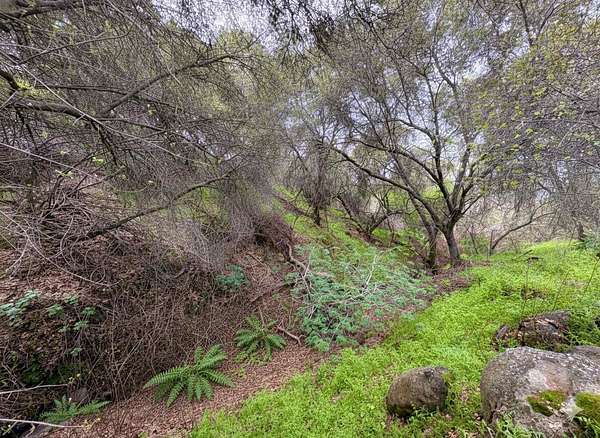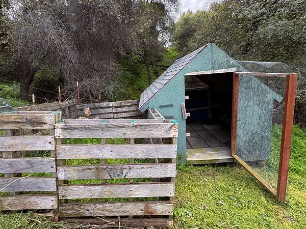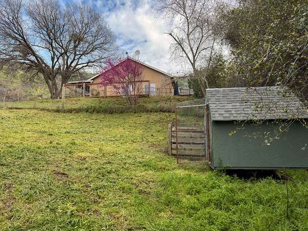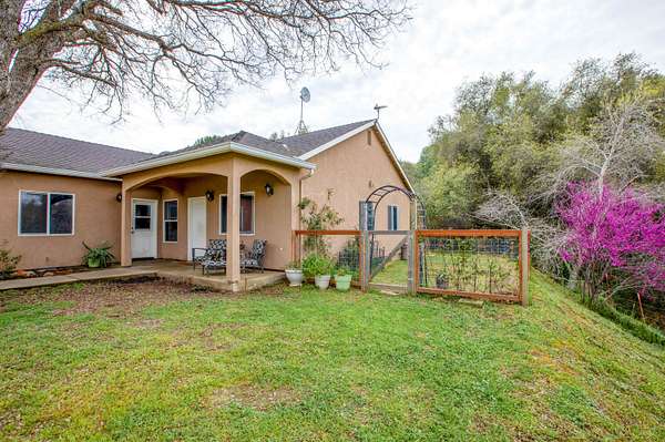 Welcome to this charming 3-bedroom, 2-bathroom home built in 2006, perfectly situated on a 2.3+/- acre corner lot in the heart of Squaw Valley. This property is a nature lover's dream, filled with mature towering oaks, buckeyes, redbuds, and ferns that line a peaceful creek. The exterior is a true retreat featuring a welcoming covered front porch and a spacious back open patio designed to take full advantage of the natural beauty and sound of the creek. The primary bedroom offers its own private access to the back patio, creating a perfect space for morning coffee or evening relaxation. For those looking for the full homestead experience, there is an established chicken coop and plenty of usable space to expand. The interior offers a modern, open-concept layout with tall, vaulted ceilings, LED can lighting, and durable laminate wood flooring. Elegant granite countertops are found throughout the home, and the kitchen is equipped with stainless steel appliances, including a gas stove and dishwasher. The home features a durable stucco exterior and easy access from the main road. Practical utility features include dual-pane windows, steel gutters, a tankless propane water heater, and an energy-efficient HVAC system. The 2-car attached garage offers convenient outside access from both sides. Enjoy the peace and quiet of foothill living while being just minutes from the local Country Store and Dunlap School, while Central Valley shopping & Kings Canyon/Sequoia National Parks are under an hour away. Whether you are looking for a full-time residence or a mountain getaway, this property offers the perfect blend of comfort and natural beauty.