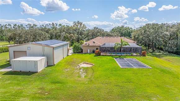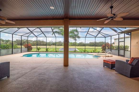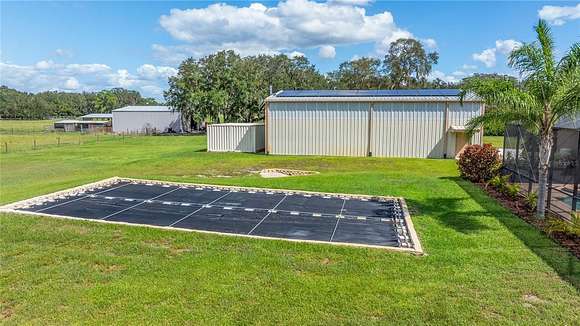 One or more photo(s) has been virtually staged. *REDUCED - $250,000 BELOW APPRAISED VALUE* 5-acre pool home ranch, built in 2016 a zero-energy ICF (Insulated Concrete Forms) constructed with superior thermal efficiency insulation, 12 inch thick walls, energy sustainable ICF Fox Blocks! is a zero energy home with dual RV garage and workshop, cross fenced and zoned for horses. The entry way drive is gated with electric opener. This amazing architectural design includes tray ceilings throughout the home with 10'8" ceilings and a well planned thought out split bedroom floor plan with a 23 x 23 octagon great room beautifully designed with matching octagon tray ceiling inclusive of integrated digital mood lighting and crown molding, in fact crown molding throughout this lovely home. Hand Crafted Custom built bookshelves in Library and in the separate office. Beautifully designed kitchen with Quartz counter-tops, two garbage disposals (1 in the Island sink and the other in the main sink) with all lower cabinetry pull-out-drawers, two Walk-in Pantries (1 in the immediate kitchen area, the other in the garage for overflow storage). The primary bedroom and ensuite bath is incredibly large inclusive of a sitting area, double mood lighted tray ceiling and crown molding, (2) walk-in closets (his & hers) with the large closet 10.8 x 14 with built-ins. The primary bath includes a large garden tub, large walk-in shower stall and is facilitated by its own hot water heater. Bedroom 2 also has its own bath with a garden tub and separate shower stall and it also is facilitated with its own hot water heater for the bedrooms on the other side of the home.. This residence is constructed with ICF (Insulated Concrete Forms) with 6" reinforced concrete exterior walls sandwiched between two layers of insulation forming 12" thick walls which provide superior thermal efficiency, sound mitigation and 200 MPH wind resistance. An R-value of 23.5+ plus whole-wall high performance enables a Zero Energy Ready residence. Continuous Natural Vapor Barrier create space with healthier air quality. PERM rating of <1.0, virtually eliminating moisture intrusion, mold and rot. This is also an "Aging in Place Home Design" totally handicap accessible. 3 separate heating and cooling zones controlled by a single digital pad on a single 4 ton, 15 seer A/C system which utilizes minimal energy, Pella Double Insulated windows with enclosed blinds. The home is an all-electrical home and the Solar panels are located on top of the detached 40 X 60 dual RV garage and not on the home eliminating any roofing or shingle issues. The RV garage has (2) RV stalls with (1) stall is a drive-through with the rear door 12'x12'. The 2 front RV doors are 12' wide x 14' high and the building is entirely insulated and structured with galvanized steel framing and 20 foot ceilings, has its own electrical panel for your RV needs. Utility bill for electric averages $33.88 a month and that cost is only for storage and transmission of energy to and from Duke Energy. Pool solar panels at ground level are for heating the pool with year-round swimming. The in-ground pool concrete with separate spa and electric heater all entirely screened enclosed. 2 10x20 steel storage containers located directly behind the RV garage and not visible from anywhere in the front of the home. Superb location high and dry with like-kind acreage homes. Looking for an energy sustainable home with acreage, this is it! Call today to view this amazingly built home!