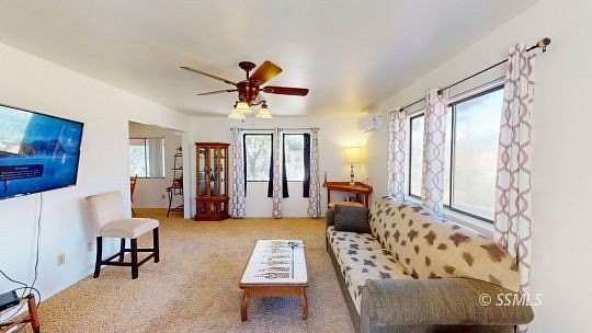 WOW! Homes like this don't come along often. If you like Mountains, having a Shop, having privacy and space...this is the one. Featuring a 3 Bed 2 Bath walk-thru floor plan of over 1700 square ft and 2.5 acres of YOUR land! Sitting on a hillside, with commanding views of the valley and mountains but lots of usable land. This home also comes completely furnished, shop tools too! Dual pane windows, 5 Mini-split units and a Pellet stove, solid wood doors, lots of cool extra features. Outside, you have a really nice, covered patio for BBQ's and family time, with those gorgeous views all around. Partway down the driveway you will see a free-standing, three-car carport. A little further down the driveway is a workshop to die for. It's not a garage, its not storage...it's an Experience! It's about 2,000 square foot of cement slabbed workshop with three roll-up doors, an office space, a half-bath and a heavy duty Vehicle Hoist. you'll have to see it to believe it. There is also a separate two car metal garage. There is a lot of yard art, some may even work still! There is SO MUCH more to this property then the limited space here will let us tell you about...give a call and come see!