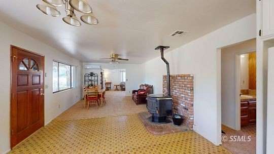 - Linoleum/Vinyl Carpet, Flooring Wheelchair Accessible, Ceiling Fans, Pellet Stove, Window Coverings, Flooring
