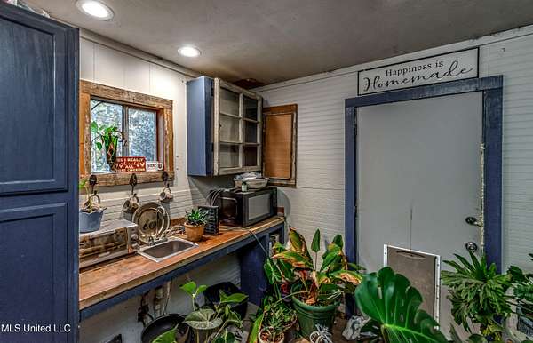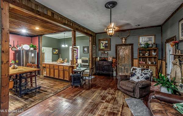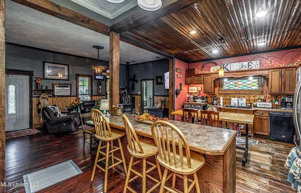 Discover the timeless beauty of this classic country style home set on approximately 4.9 acres. Natural wood siding, rustic details, and ample space for a small farm or peaceful retreat, this property offers the perfect blend of comfort and country living. The covered porch provides shade year round creating an ideal spot to relax and take in the serene surroundings. The living area combines rustic charm with modern comfort. rich hardwood floors, natural wood wainscoting, and warm neutral tones create a cozy inviting feel. Large windows fill the space with natural light, while a wood-burning stove adds warmth and a touch of country tradition. The corrugated accent wall, farmhouse trim, and vintage style lighting lend this room a distinctive personality ideal for relaxing or entertaining. The kitchen continues the farmhouse charm with rich wood cabinetry, beadboard walls, and a corrugated metal ceiling accented by recessed lighting. A wooden island with a butcher-block top anchors the space, complemented by stainless steel appliances, including a modern range and french door refrigerator. A decorative stained-glass window above the sink adds a cheerful splash of color to this rustic inviting space. The primary suite offers a spacious area for relaxing featuring a walk-in closet and a large bathroom with both a jetted tub and a separate shower. Two additional bedrooms and a second bath, complete with a large, handicap accessible shower providing comfort and flexibility for family or guests. Outside, enjoy the tranquility of nature in your own backyard. A picturesque pond, surrounded by mature trees and gently rolling terrain, creates a serene setting for fishing, picnics, or simply unwinding. A three bay metal carport currently being used a barn sits just beyond the pond ideal for equipment, horses or small farm animals. The fenced garden area provides space to grow your own vegetables or flowers. Two metal shops and one utility building offer plenty of room for storage, hobbies, or your next business venture. This charming property won't last long! Call today to schedule your private tour!
