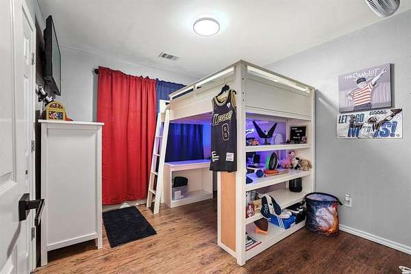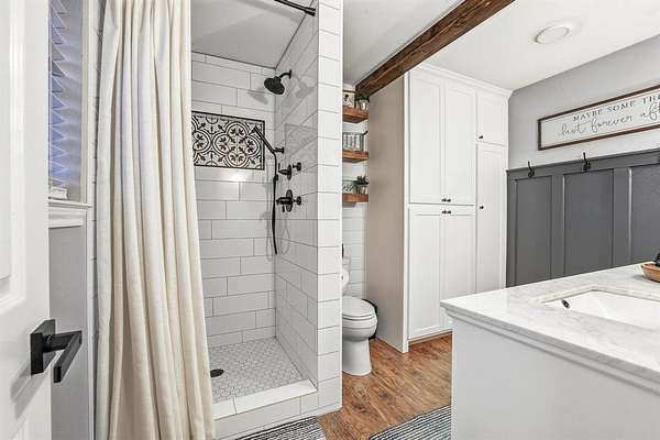 The eat-in kitchen features a large island with quartz countertops, propane range, stainless steel appliances, and seamless flow into the main living area. The private primary suite includes dual sinks, a walk-in shower, and a built-in closet. Each additional bedroom offers a walk-in closet.