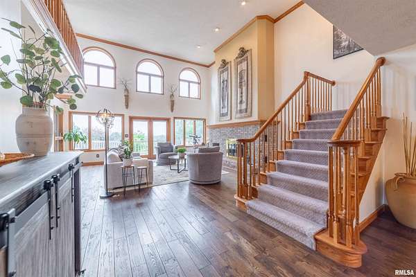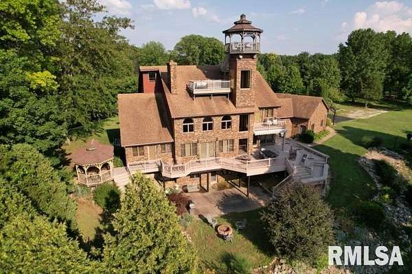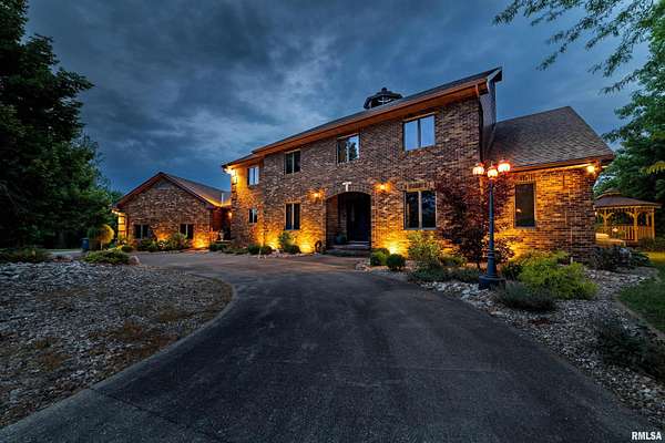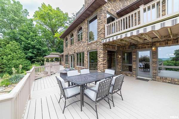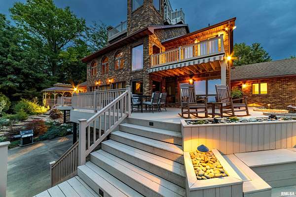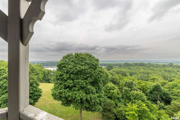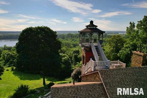 A lighted brick entrance to this stunning 5 bedroom and 5 bath estate on the bluff overlooking the Mississippi River Valley. A one of a kind 4 story glass elevator that goes from the basement to the rooftop gazebo. The finished walkout basement is designed for entertainment with a shuffleboard room, a pool table room, 2 bar areas, a home theater room, a tool room, utility room and a separate stairway to the 3 car garage. The fully furnished home is ready for immediate occupancy. A massive composite deck area that comes with a Sunsetter awning and a hot tub gazebo off the 1st floor master bedroom. All Anderson brand windows and doors. New flooring, tile, hardwood, carpet and paint in 2024. Almost a 1/4 mile of wood stained fencing was added in 2024. This home has beautiful landscaped grounds. Also available for additional purchase are 2 adjoining lots which consist of 1.48 acres with a 30 X 50 storage shed and a 2.62 acre bluff lot. All located just outside the Quincy city limits.
