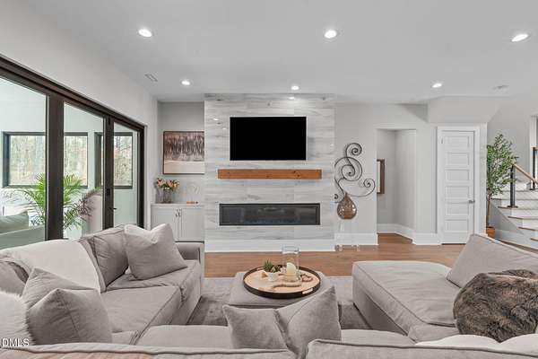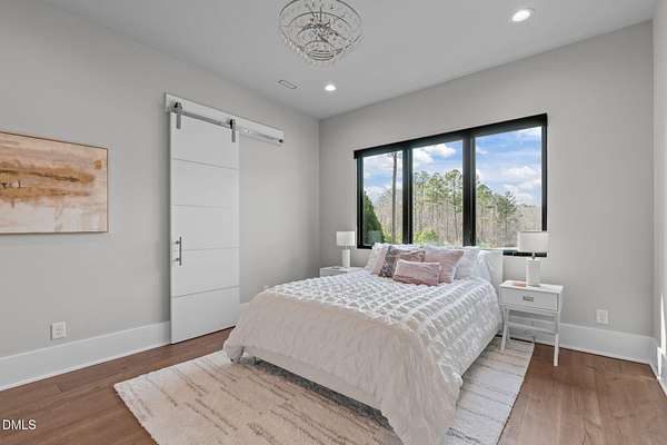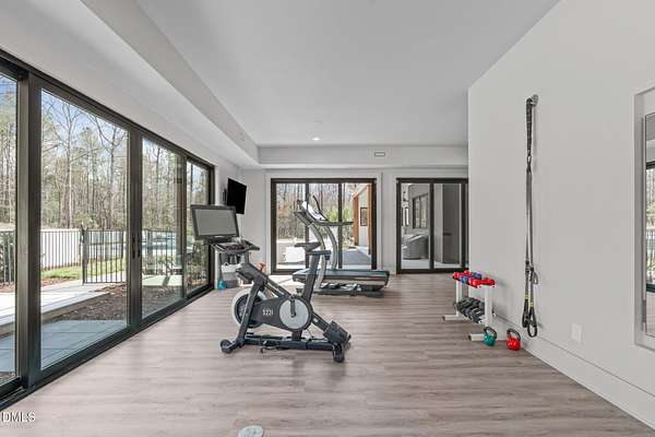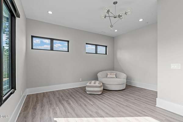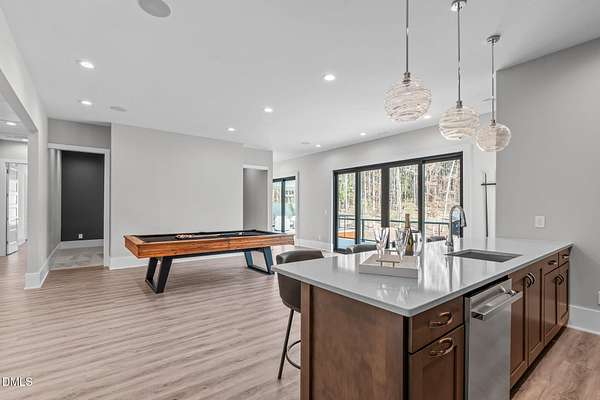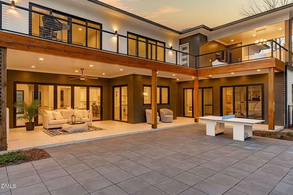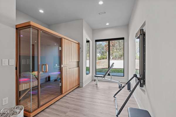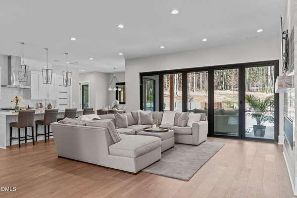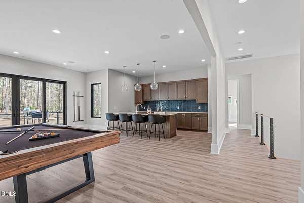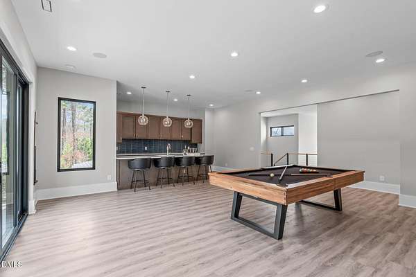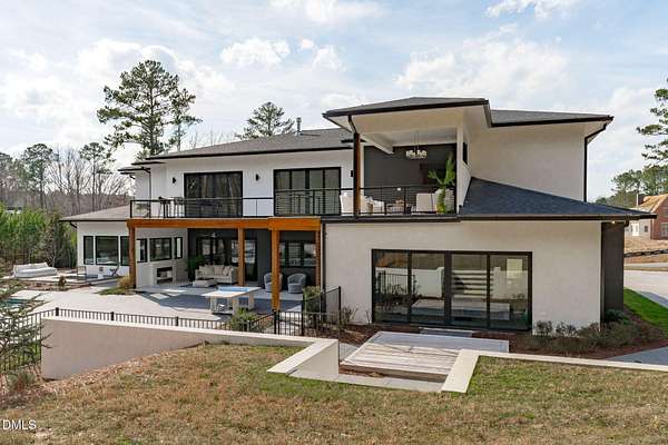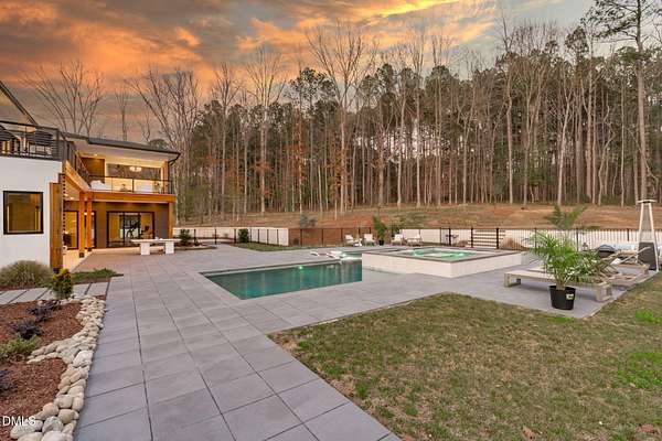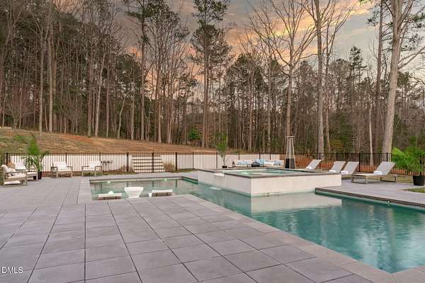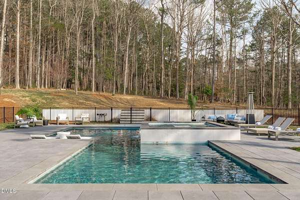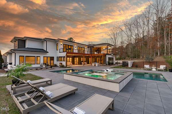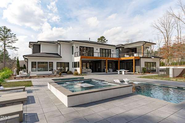 Welcome to 394 Carolina Crossing, where modern design meets resort style living on just over 2.5 private acres in Apex. Entertaining is a breeze with alomost 7,000 sqft of expansive living spaces filled with natural light. Featuring a wine bar, dedicated wellness room with a sauna, and an upstairs loft with its own bar, kitchenette, and full movie theater. The primary suite offers a true retreat with a private hot tub, spa inspired bath with a soaking tub, and a luxurious dressing room with a vanity. Upstairs you'll find 3 additional bedrooms, all with their own en-suite bath. Outdoors, enjoy two spacious decks including a second level covered lounge, a resort style pool and hot tub, and a full basketball and sport court. The home also includes a three car garage.