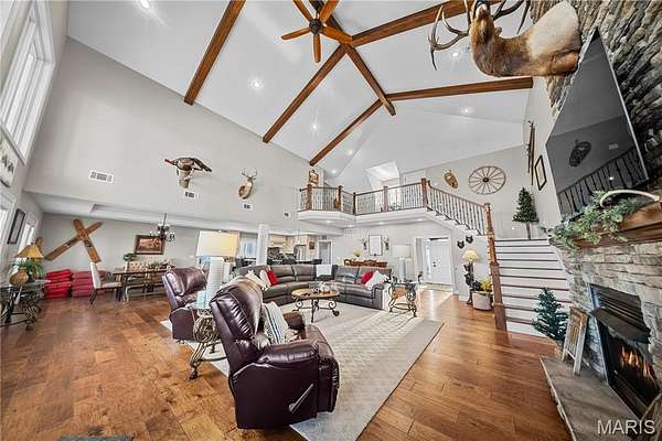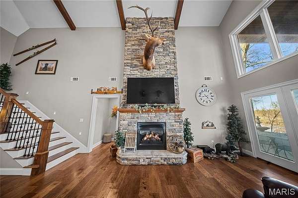 The custom home is thoughtfully designed to blend comfort, character, and scenic beauty. Inside, you are greeted by hardwood floors, plantation-style shutters, and a flowing open layout that highlights the surrounding natural setting. The living room is a true showpiece, featuring 23-foot vaulted ceilings with rustic beams and a stunning 22-foot stone gas fireplace, creating an unforgettable focal point and a warm, lodge-style atmosphere ideal for entertaining or quiet evenings at home.